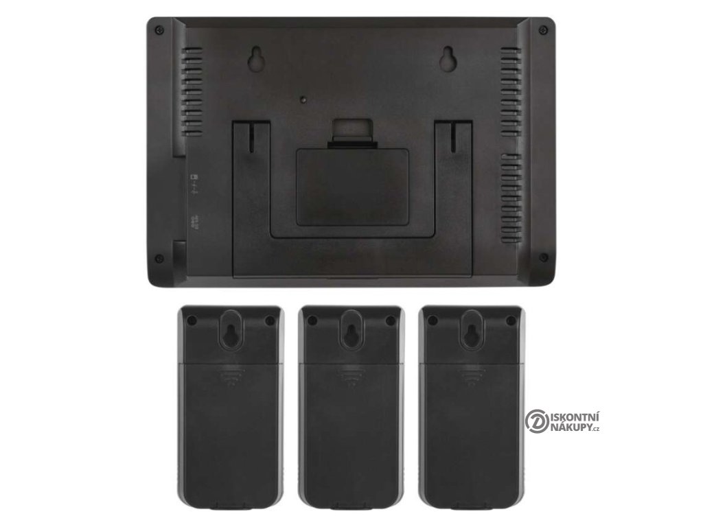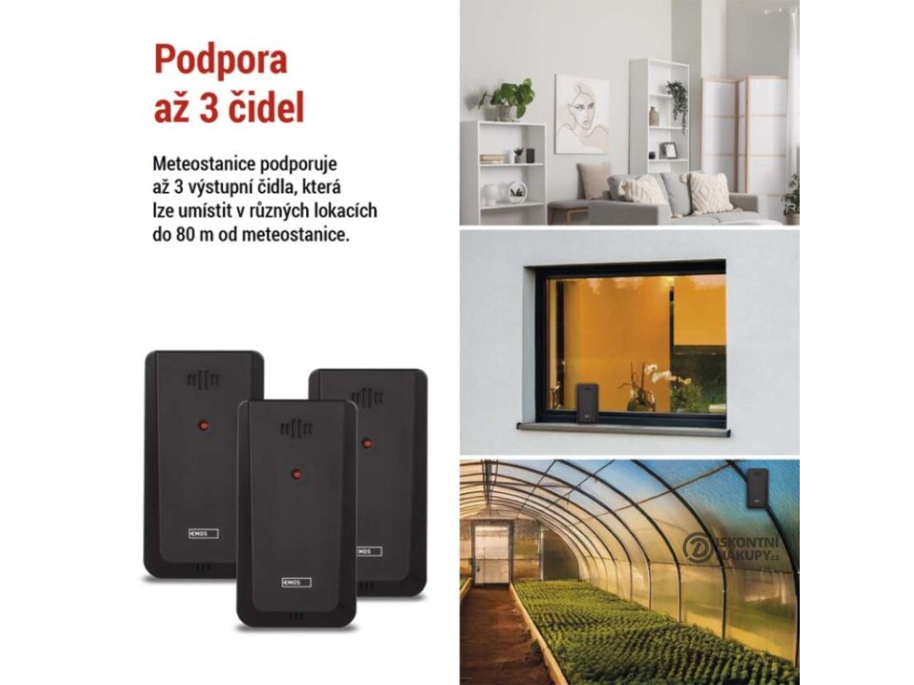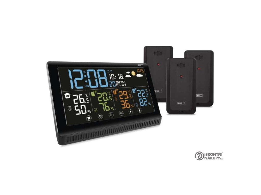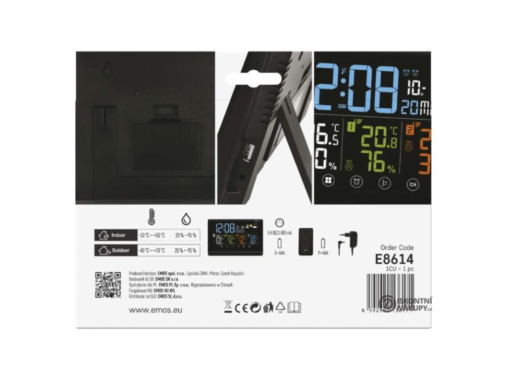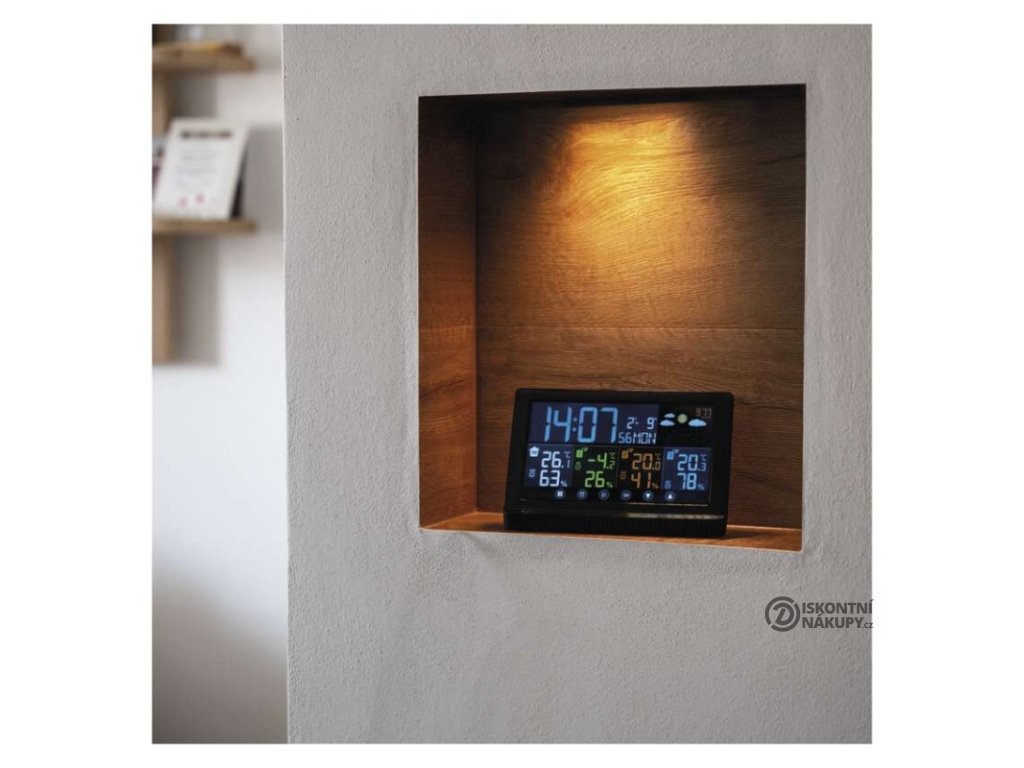 12/24 formát času: ano|anemometr: ne|barevný displej (black mask) podsvícený: ano|barometr: ano|budík: ano, 2×|časová pásma: ano|další funkce: USB–A napájecí výstup|datum: ano|dosah čidla: až 80 m|drátová sonda k čidlu: ne|elektronické plošné podsvícení: ano|fáze měsíce: ne|hodiny: řízené DCF signálem|kalendář: ano|kompatibilita: -|korekce nadmořské výšky: ne|LED podsvícení displeje: ano|min. a max. teplota: ano|možné další čidlo: až 3 čidla (E00387, E05018)|možnost nastavení jednotky teploty: °C/°F|možnost pověšení na zeď: ano|napájení čidla: 2× 1,5 V AAA (nejsou součástí balení)|napájení stanice: 3× 1,5 V AAA (nejsou součástí balení)|notifikace do mobilní aplikace: -|opakované buzení: ano|ovládání hlasovými asistenty: -|podporované OS: -|předpověď počasí: ano|přenosová frekvence: 433 MHz|prodejní obal: 1 ks, krabička|produkt: meteostanice|projekce: ne|protokol: -|provedení: bezdrátové|rozměr čidla: 50 × 25 × 95 mm|rozměr hlavní jednotky: 198 × 30 × 132 mm|síťový adaptér: ano, 5 V DC/1 000 mA (součástí balení)|srážkoměr: ne|teplotní výstraha: ne|trend teploty: ne|trend tlaku: ano|trvalé podsvícení: ano|velikost displeje: 169 × 93 mm|venkovní teplota: -40 °C až +70 °C, rozlišení 0,1 °C|venkovní vlhkost: 20 % až 95 % RV, rozlišení 1 %|vnitřní teplota: -10 °C až +50 °C, rozlišení 0,1 °C|vnitřní vlhkost: 20 % až 95 % RV, rozlišení 1 %Popis produktu