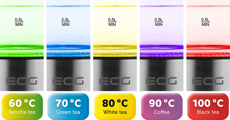 Zcela jistě nejvýraznějším prvkem rychlovarné konvice ECG RK 1777 Colore jsou pestré barvy jejího podsvícení, měnící se na základě konfigurace konkrétních teplot. Teplotu lze nastavit na 5 různých hodnot, korespondujících s konkrétními barvami – zelená pro 60 °C (čaj Sencha), modrá pro 70 °C (zelený čaj), žlutá pro 80 °C, fialová pro 90 °C (černý čaj) a červená pro 100 °C (káva).
