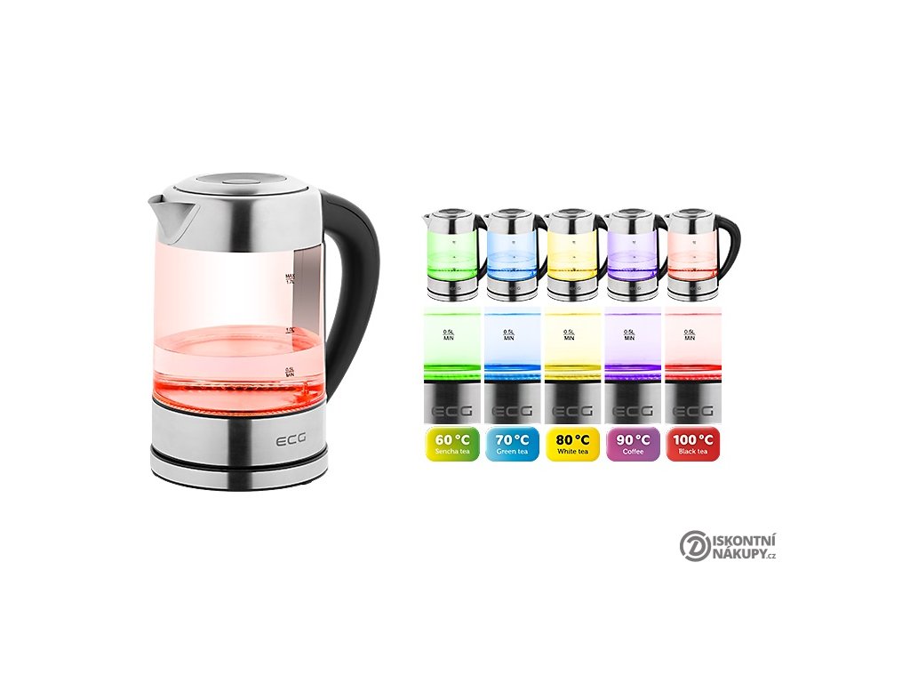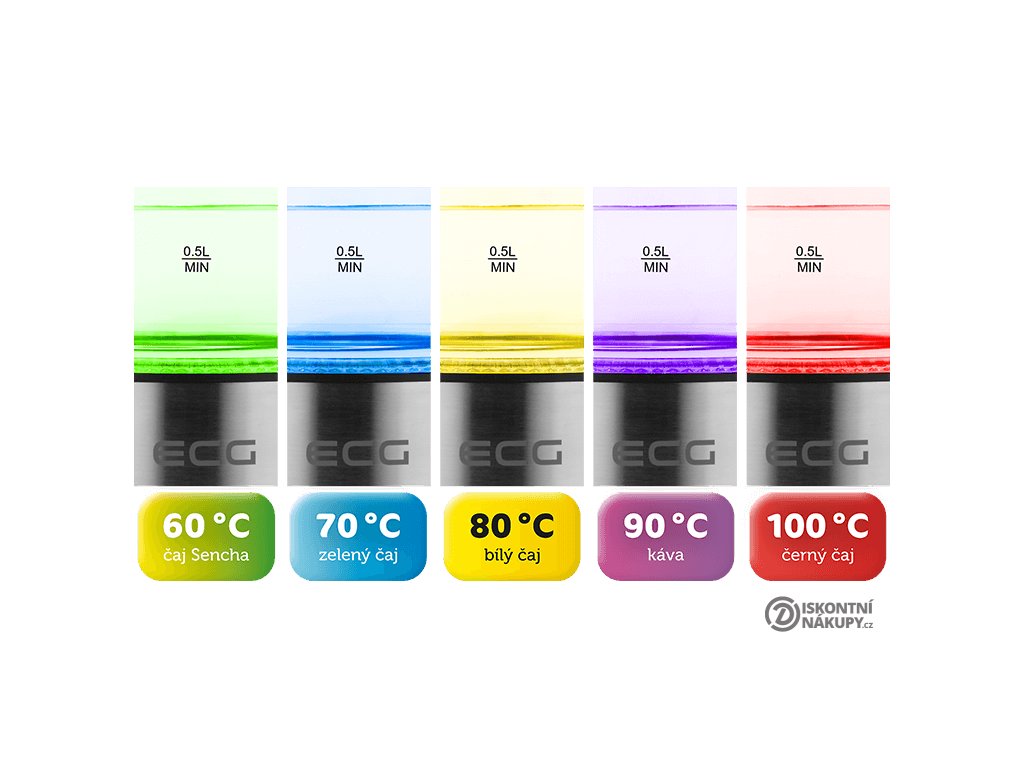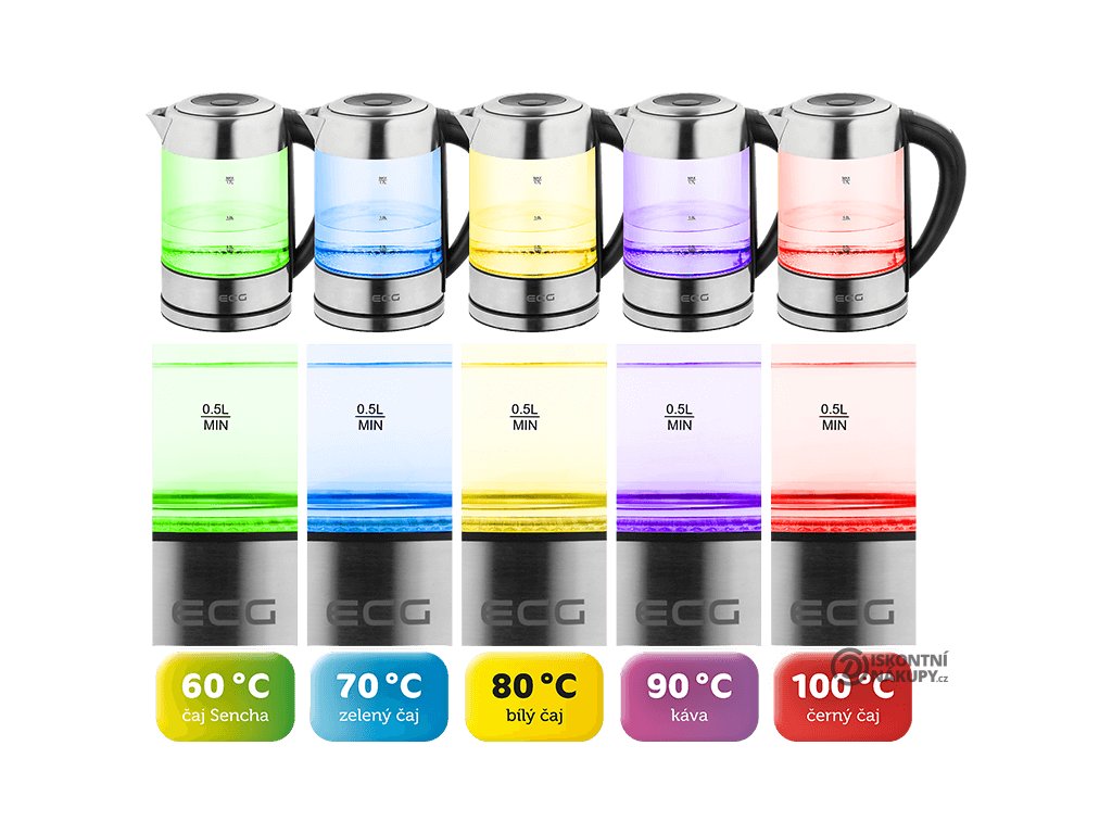 Zcela jistě nejvýraznějším prvkem rychlovarné konvice ECG RK 1777 Colore jsou pestré barvy jejího podsvícení, měnící se na základě konfigurace konkrétních teplot. Teplotu lze nastavit na 5 různých hodnot, korespondujících s konkrétními barvami – zelená pro 60 °C (čaj Sencha), modrá pro 70 °C (zelený čaj), žlutá pro 80 °C, fialová pro 90 °C (černý čaj) a červená pro 100 °C (káva).