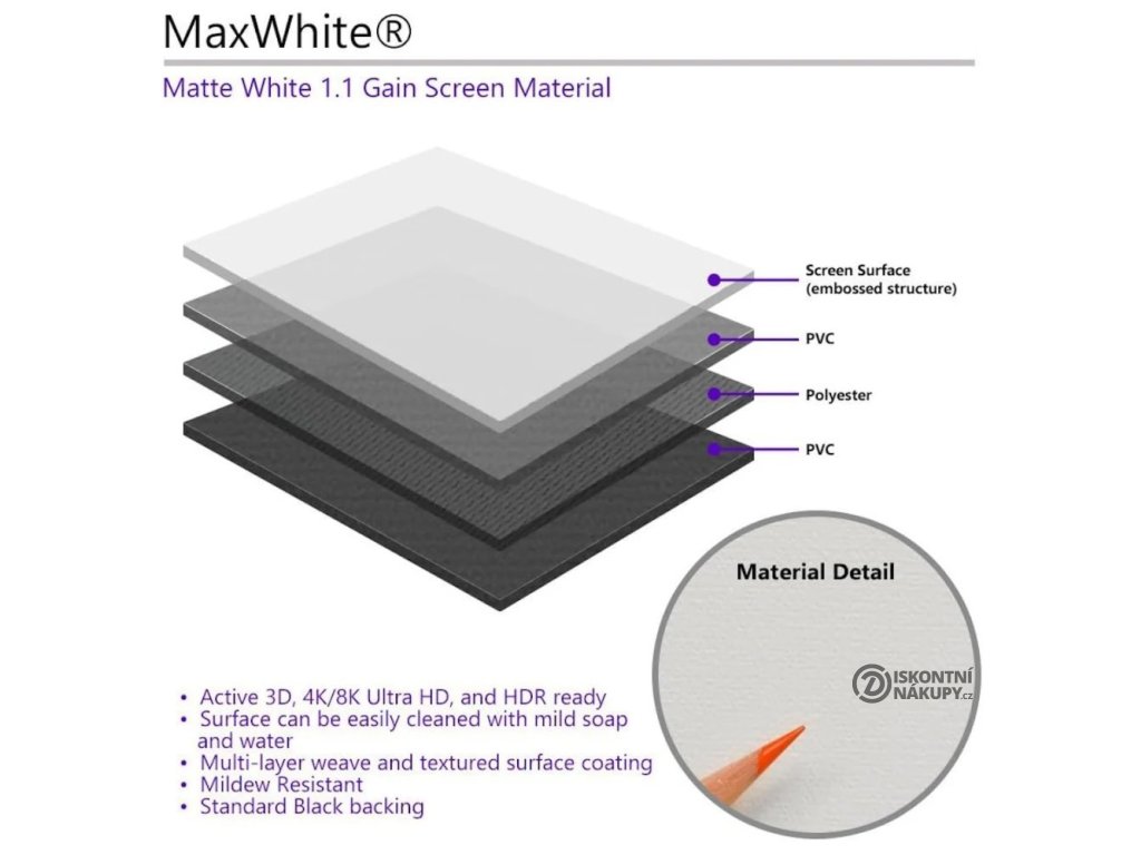 MaxWhite je nejuniverzálnější povrch plátna pro přední projekci prezentace. Tento materiál poskytuje široký pozorovací úhel, perfektní rovnoměrnost rozptylu, jasný obraz a skvělou reprodukci barev.