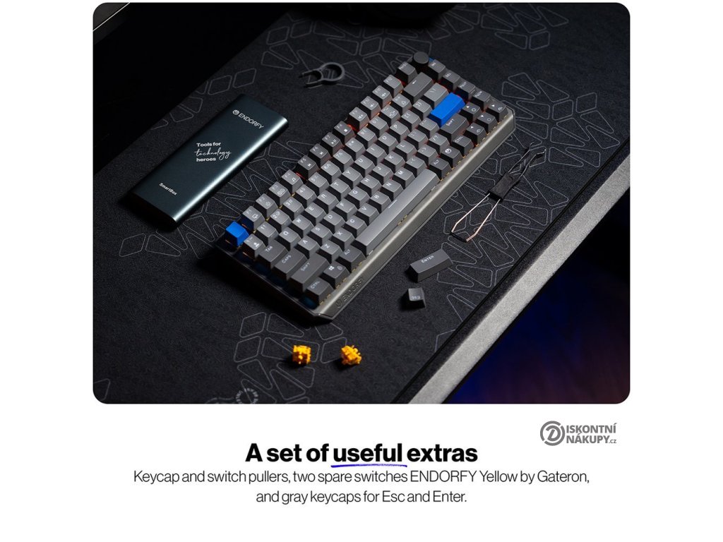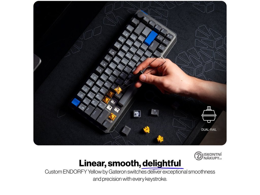 - Proprietární lineární spínače Endorfy Yellow by Gateron s tovární lubrikací a dvojitou kolejnicí