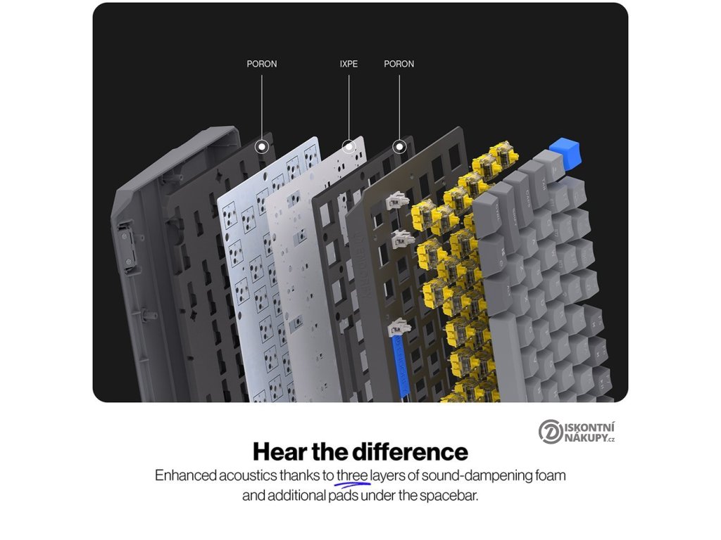 Speciálně vyladěná akustika využívá tři vrstvy pěnového tlumení pro minimalizaci ozvěny. I mezerník je odhlučen silikonovými podložkami, takže každý úhoz zní čistě a uspokojivě.