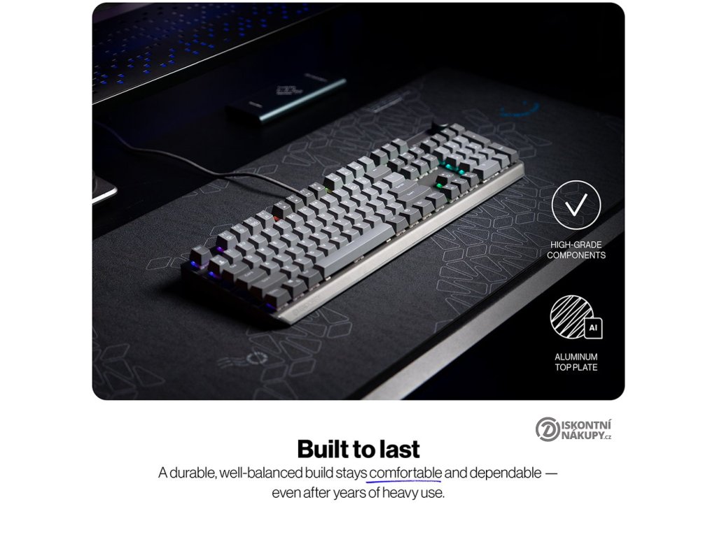 Klávesnice je vyrobena z prémiových materiálů a vyztužena pevnou hliníkovou horní deskou, díky čemuž nabízí robustní a vyvážený pocit při používání. Tři vrstvy akustické pěny PORON, EPDM a IXPE minimalizují ozvěnu a eliminují dutý zvuk při psaní pro čistý a uspokojivý akustický zážitek.