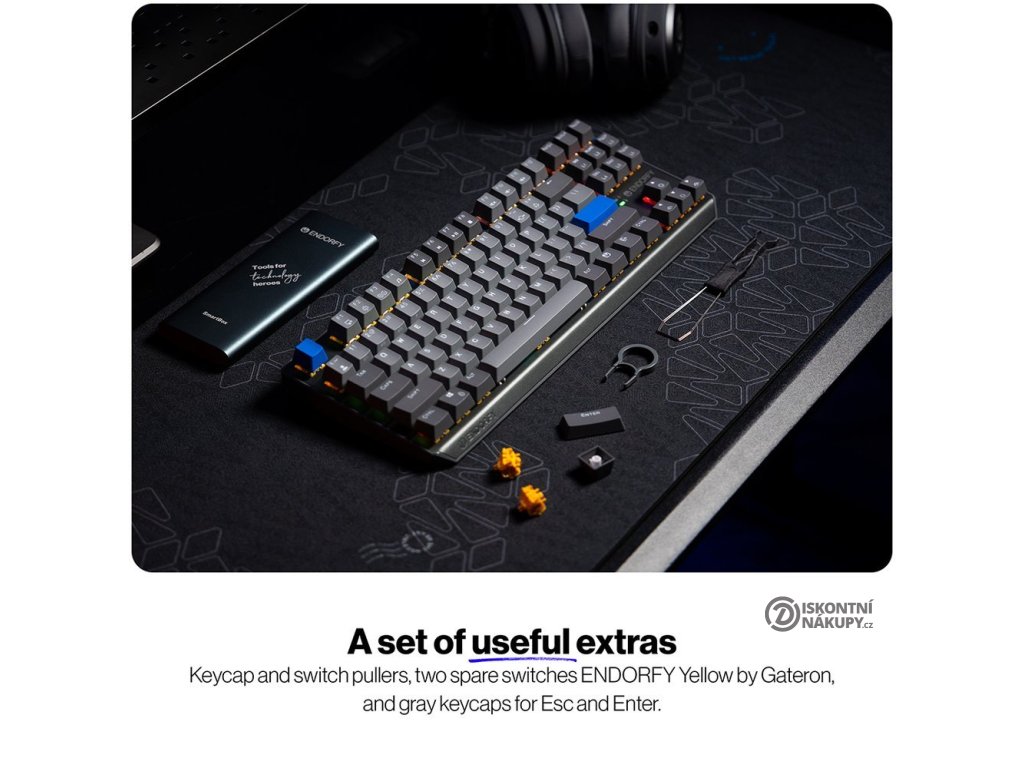 Klávesnice je dodávána s 2,4GHz USB donglem, nástroji na sejmutí kláves a spínačů, dvěma náhradními spínači Endorfy Yellow a minimalistickými šedými klávesami Esc a Enter pro personalizaci vzhledu.