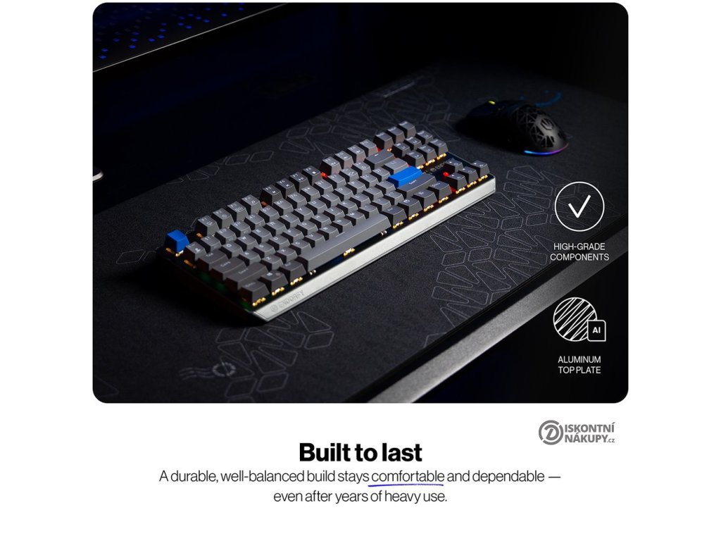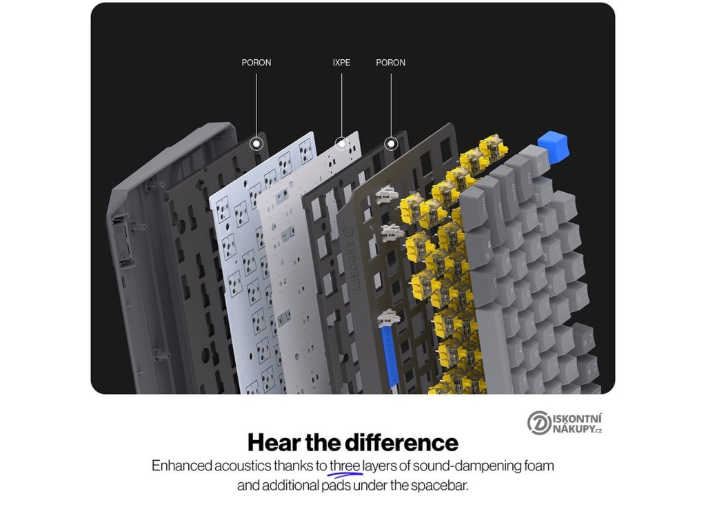 Klávesnice Endorfy Thock V2 TKL Wireless CZ je ideální volbou pro ty, kteří preferují rychlost, přesnost a styl. Tělo vyztužené horní hliníkovou deskou zvyšuje pevnost, stabilitu a je připraveno na pořádnou herní bitvu. Provedení s 3 vrstvami akustické pěny eliminuje vibrace a dutý zvuk. Díky tomu je každý stisk příjemný a klávesnice nezní jako nějaké staré železo.