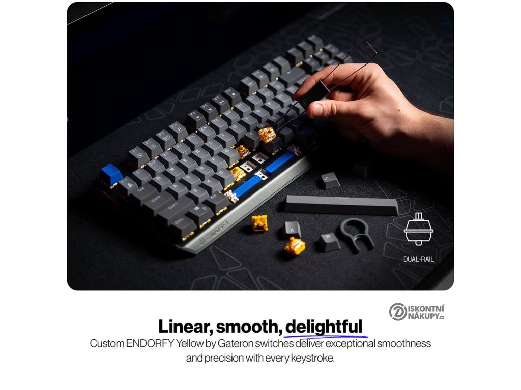 Speciální lineární spínače Endorfy Yellow zajišťují výjimečně plynulý a přesný chod. Díky továrně lubrikované konstrukci s dvojitou kolejnicí a dvoustupňové pružině je každý stisk měkký a příjemný. Funkce hot-swap umožňuje výměnu spínačů bez pájení.