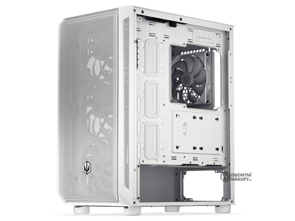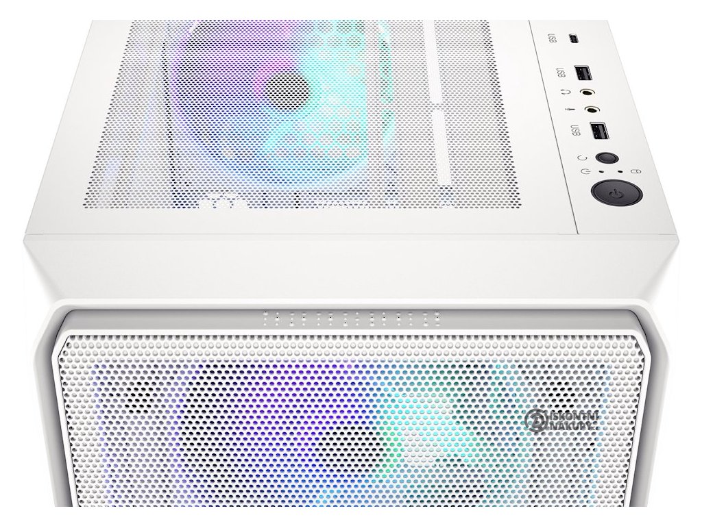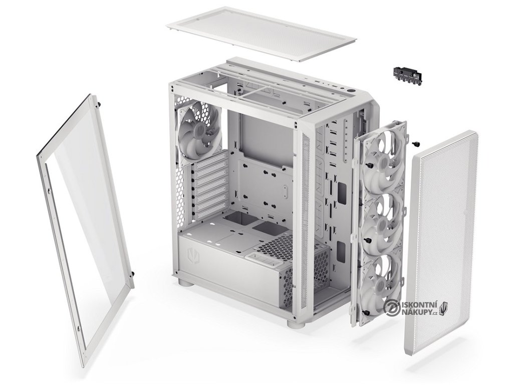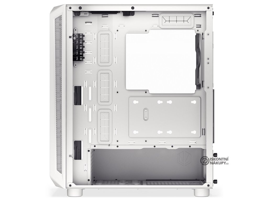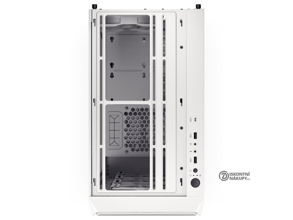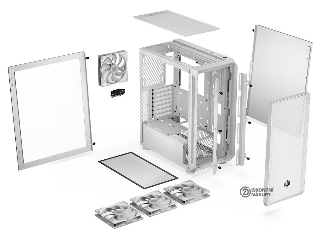 Skříň nabízí prostor pro 7 ventilátorů a dodává se se 4 předinstalovanými ventilátory Stratus 140 White PWM ARGB – 3 vpředu a 1 vzadu. Je kompatibilní se základními deskami ATX plné velikosti a podporuje radiátory vodního chlazení až 360mm. Moderní I/O panel obsahuje rychlý USB-C 3.2 Gen2 port s rychlostí až 10 Gb/s.