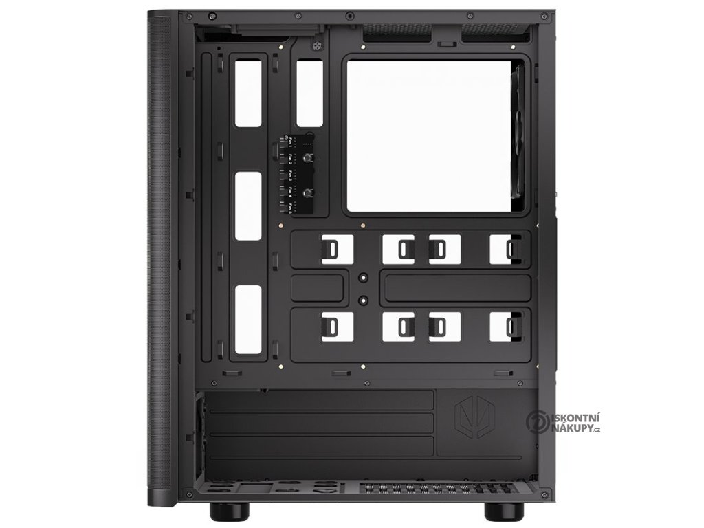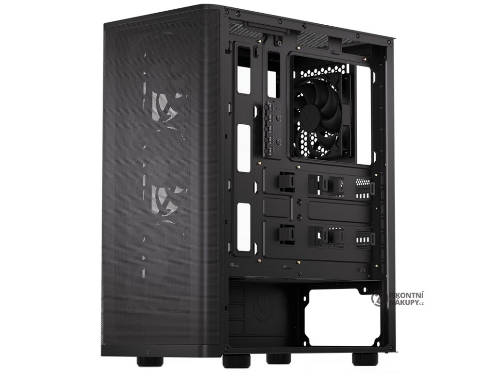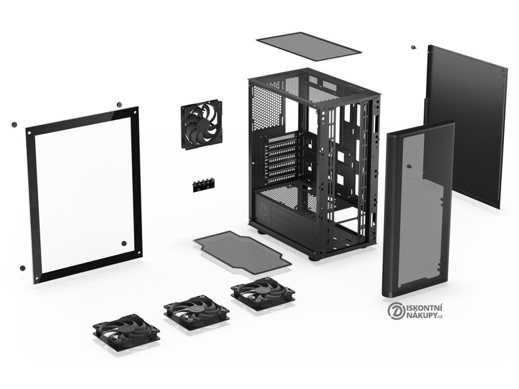 Endorfy Ventum 200 AirSkříň formátu Middle Tower s průhlednou bočnicí z tvrzeného skla nabízí dvě 2,5" pozice pro SSD disky a jednu 3,5" pozici pro pevný disk. Na horní části se nachází dva USB 3.0 porty, sluchátkový výstup a audio vstup pro mikrofon. Vybavena je čtyřmi 120 mm ventilátory, které spolu s perforovaným čelním panelem zajišťují dostatečné proudění vzduchu. Důmyslné řešení umožňuje pohodlné umístění až 360 mm dlouhého výměníku vodního chlazení na přední straně. Ve skříni je dostatek prostoru pro chladič CPU do výšky až 161 mm a grafickou kartu o délce až 315 mm. Dodávána je bez zdroje. Součástí je také sada prachových filtrů.
