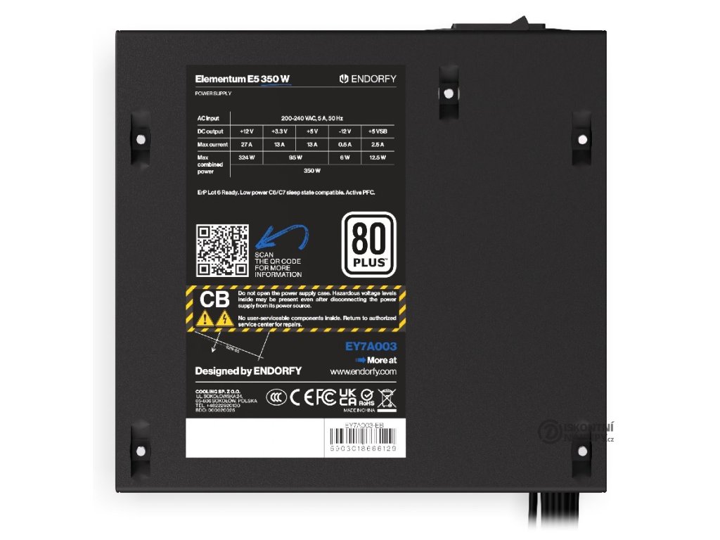 Endorfy Elementum E5 350 WNapájecí zdroj s výkonem 350 W je osazen tichým 120 mm ventilátorem s aktivním řízením..