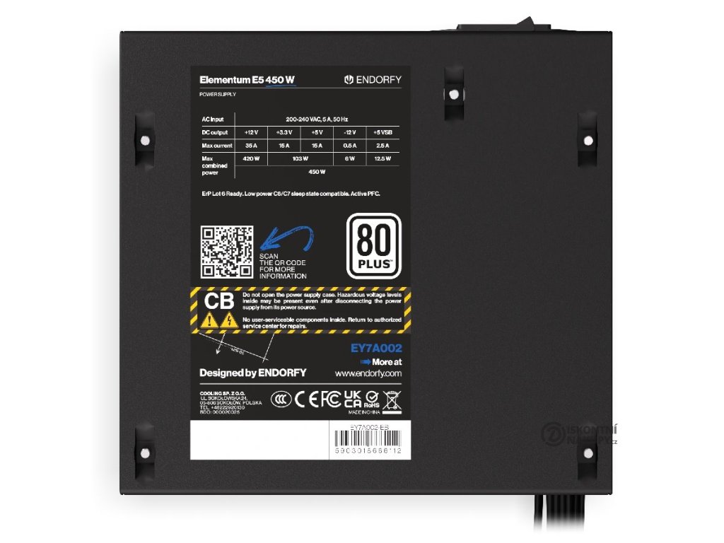 Endorfy Elementum E5 450 WNapájecí zdroj s výkonem 450 W je osazen tichým 120 mm ventilátorem s aktivním řízením..