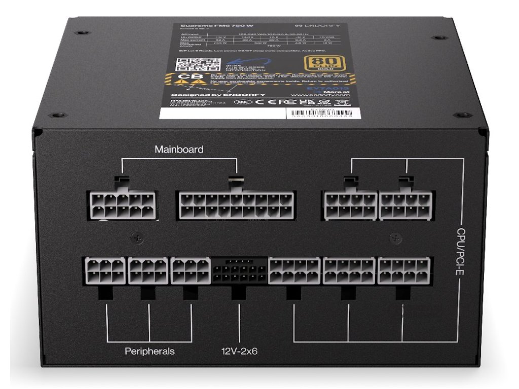 Napájecí zdroj Endorfy Supremo FM6 s vysokou účinností, který je navržen pro moderní PC sestavy zaměřené na náročný provoz. Certifikace 80 PLUS Gold je zárukou vysoké energetické účinnosti a stability. Kvalitní konstrukce, včetně prémiových kondenzátorů, zajistí dlouhou životnost.