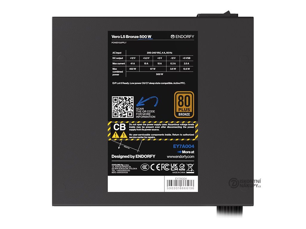 Endorfy Vero L5 Bronze 500 WNapájecí zdroj o výkonu 500 W je osazen tichým 120 mm velkým ventilátorem. Zdroj splňuje certifikaci 80 PLUS Bronze.