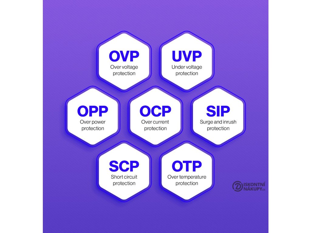 - Kompletní sada ochranných prvků OVP, UVP, OCP, SCP, OPP, SIP a OTP