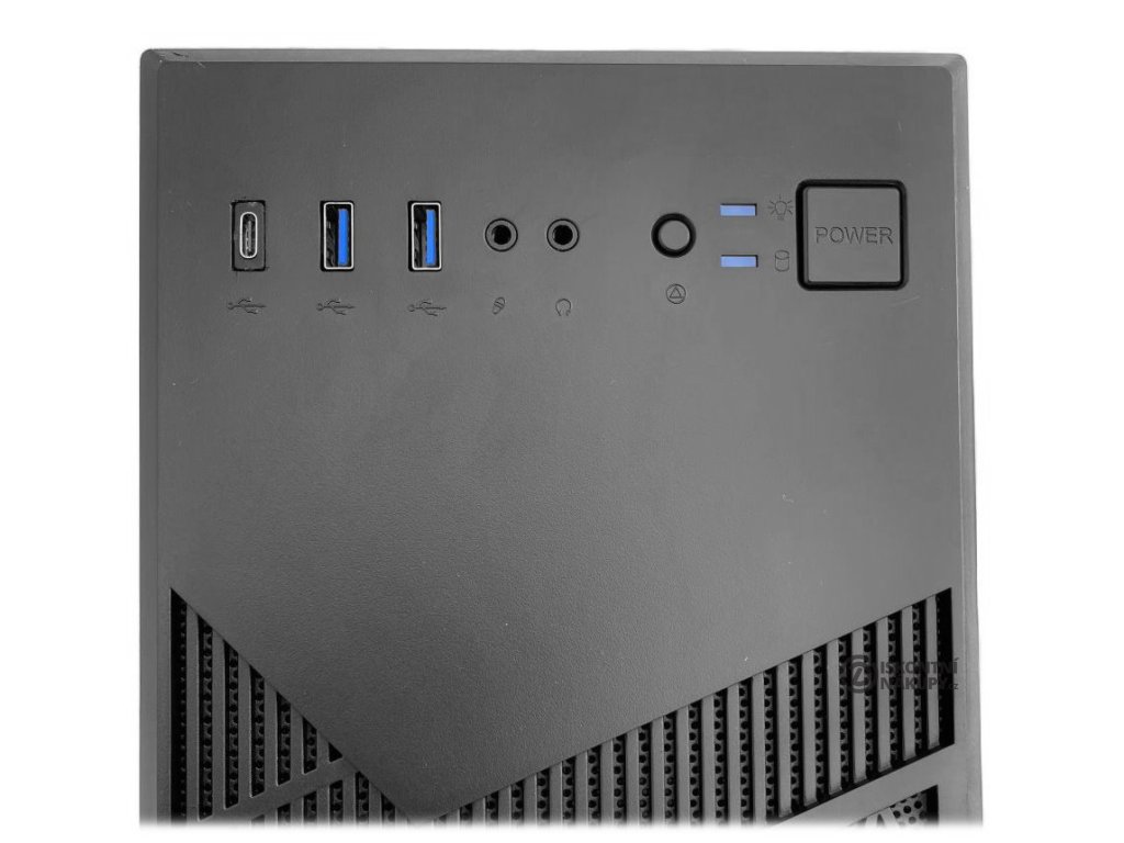 Konektory na předním panelu: 2× USB 3.0, 1× USB-C, 1× sluchátkový výstup, 1× vstup pro mikrofon