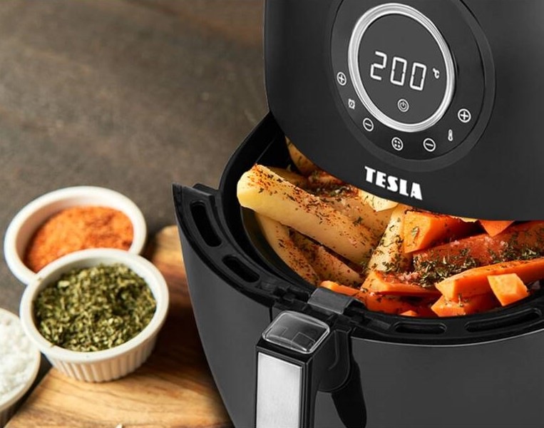 horkovzdušná fritéza • příkon 1 800 W • objem 6 l • digitální dotykový panel • 8 přednastavených programů • časovač • nastavitelná teplota v rozmezí 80–200 °C • ochrana proti přehřátí • výrobce Tesla Electronics nabízí prodlouženu záruku 2+1 po registraci na jejich stránkách •