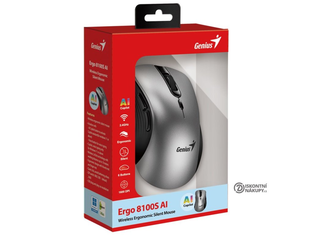 Pro bezdrátové připojení myši Genius Ergo 8100S AI slouží adaptér USB, který využívá technologii 2,4 GHz. Mezi další přednosti patří přítomnost tlačítek pro vyvolání nástroje Microsoft Copilot a aktivaci hlasového zadávání. Asistent Copilot využijete například při přípravě dokumentů, e-mailů a dalších textů. Efektivně zrychlí kancelářské procesy při přípravě na schůzku, prezentaci a další mítinky, hledání informací apod.