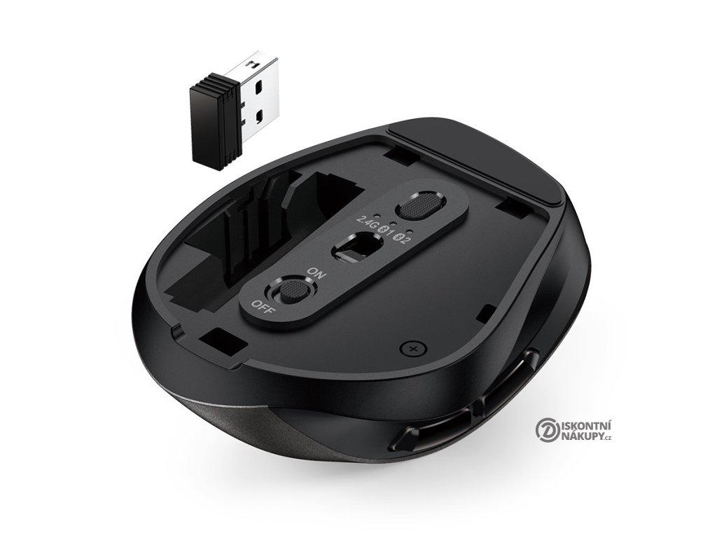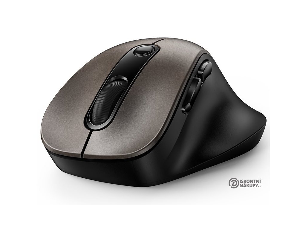 Ergonomická bezdrátová myš disponující optickým senzorem s nastavitelným rozlišením až 2400 DPI. Připojení k počítači je realizováno bezdrátově skrze Bluetooth nebo miniaturní USB přijímač a rozhraní 2,4 GHz. Myš se dokáže připojit až ke 3 zařízením zároveň, mezi nimi pak můžete přepínat stiskem jediného tlačítka (Dual BT režim + 2,4 GHz).