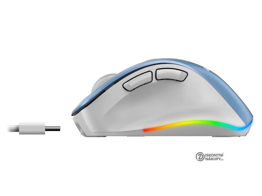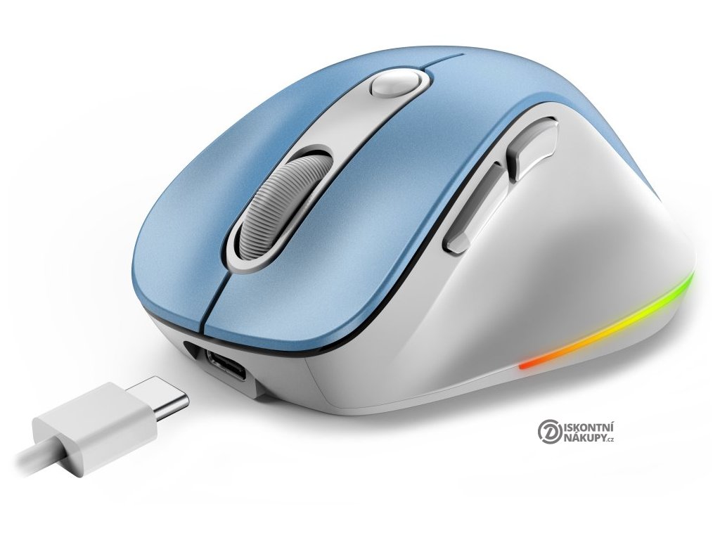 Ergonomická bezdrátová myš v kompaktním provedení disponuje optickým senzorem s nastavitelným rozlišením až 2400 DPI. Připojení k počítači je realizováno bezdrátově skrze Bluetooth nebo miniaturní USB přijímač a rozhraní 2,4 GHz. Myš se dokáže připojit až ke 3 zařízením zároveň, mezi nimi pak můžete přepínat stiskem jediného tlačítka (Dual BT režim + 2,4 GHz). USB přijímač lze pro snadné přenášení uschovat v těle myši. Napájení zajišťuje vestavěná dobíjecí baterie s kapacitou 500 mAh, kterou lze nabíjet pomocí USB-C portu. Potěší také stylové sedmibarevné podsvícení.