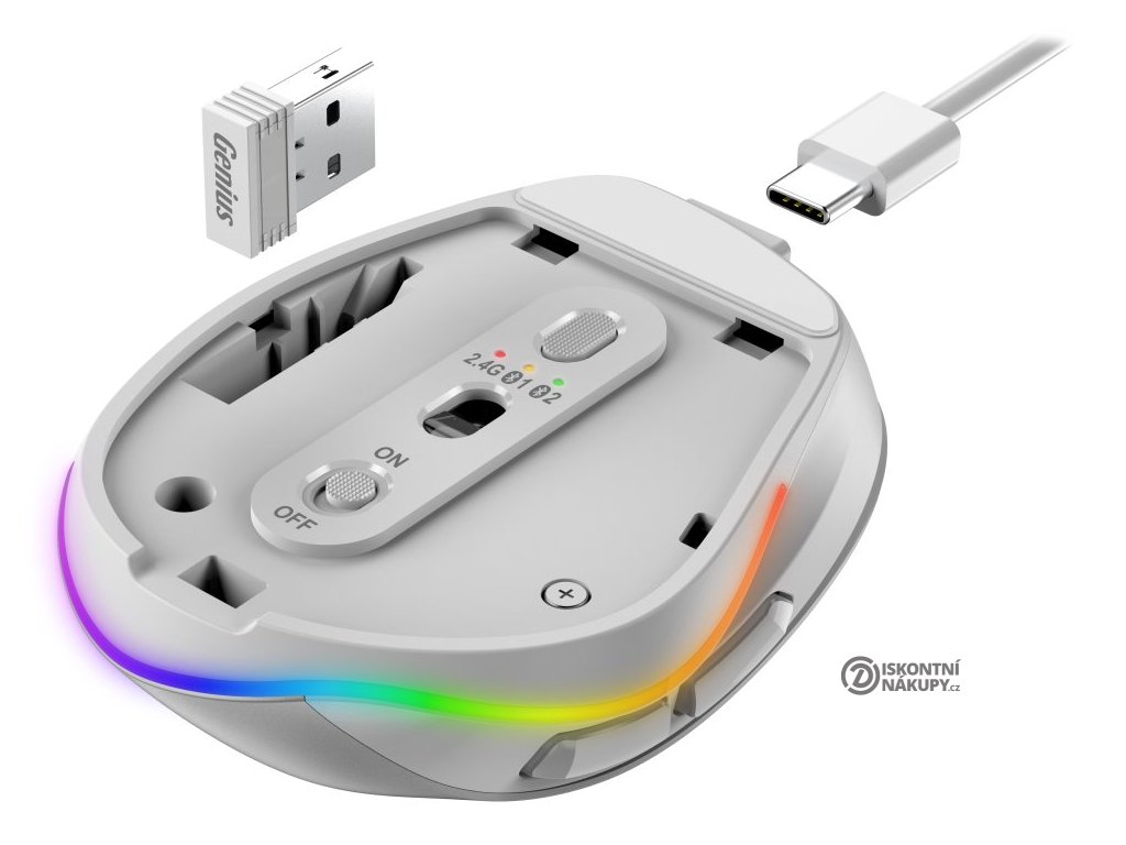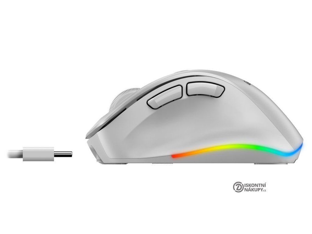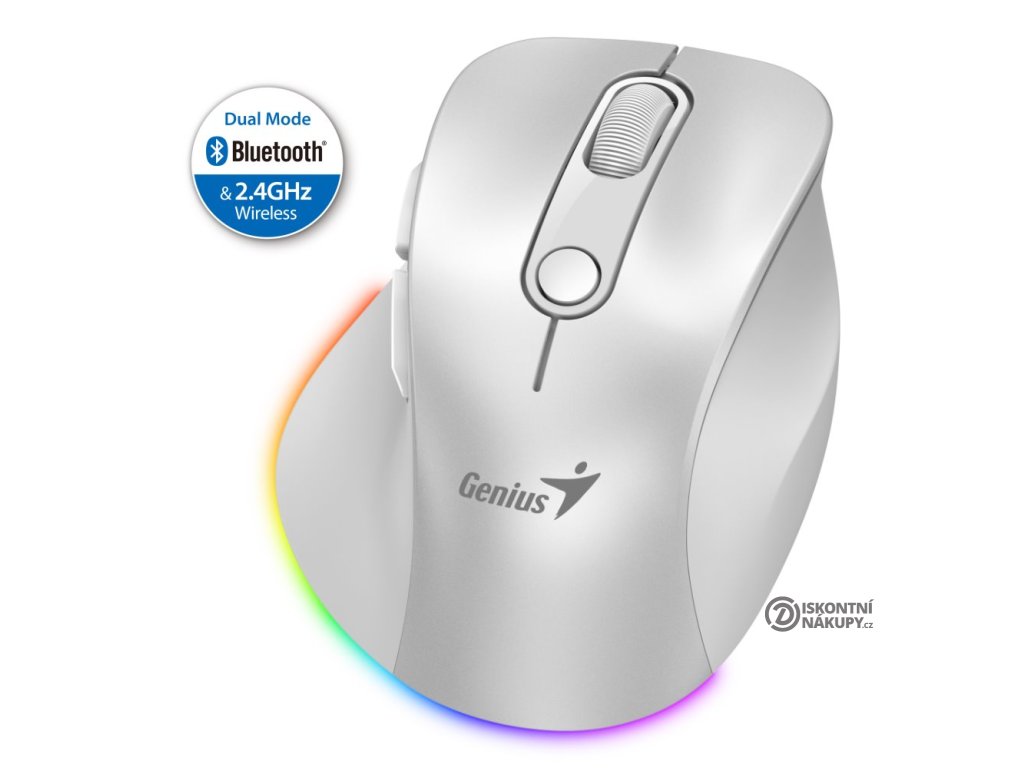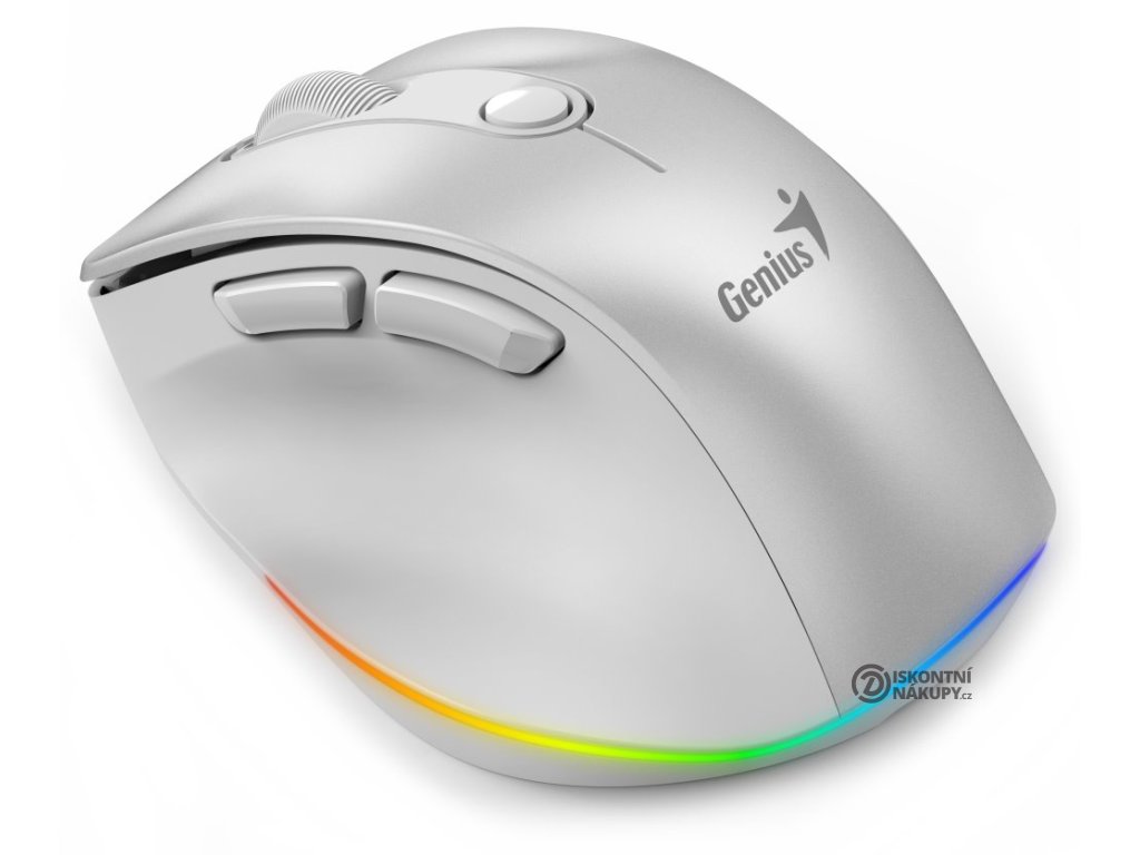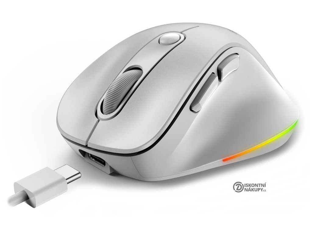 Ergonomická bezdrátová myš v kompaktním provedení disponuje optickým senzorem s nastavitelným rozlišením až 2400 DPI. Připojení k počítači je realizováno bezdrátově skrze Bluetooth nebo miniaturní USB přijímač a rozhraní 2,4 GHz. Myš se dokáže připojit až ke 3 zařízením zároveň, mezi nimi pak můžete přepínat stiskem jediného tlačítka (Dual BT režim + 2,4 GHz). USB přijímač lze pro snadné přenášení uschovat v těle myši. Napájení zajišťuje vestavěná dobíjecí baterie s kapacitou 500 mAh, kterou lze nabíjet pomocí USB-C portu. Potěší také stylové sedmibarevné podsvícení.