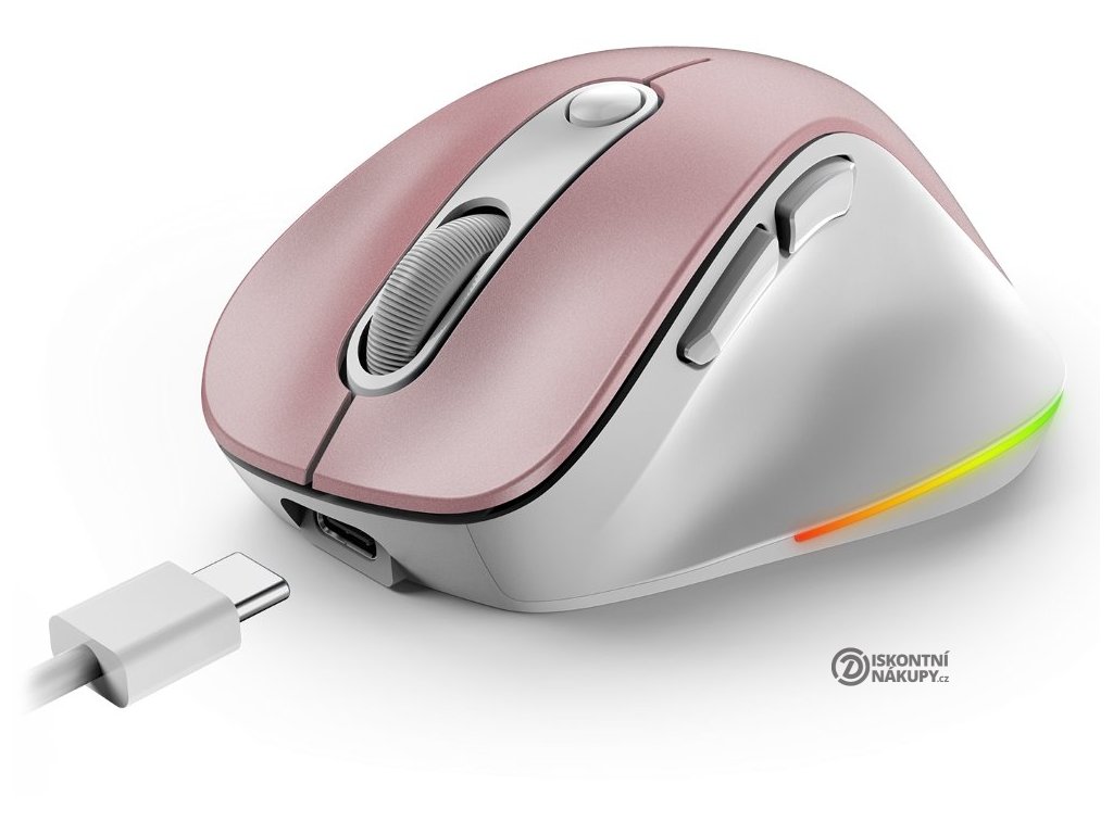 Ergonomická bezdrátová myš v kompaktním provedení disponuje optickým senzorem s nastavitelným rozlišením až 2400 DPI. Připojení k počítači je realizováno bezdrátově skrze Bluetooth nebo miniaturní USB přijímač a rozhraní 2,4 GHz. Myš se dokáže připojit až ke 3 zařízením zároveň, mezi nimi pak můžete přepínat stiskem jediného tlačítka (Dual BT režim + 2,4 GHz). USB přijímač lze pro snadné přenášení uschovat v těle myši. Napájení zajišťuje vestavěná dobíjecí baterie s kapacitou 500 mAh, kterou lze nabíjet pomocí USB-C portu. Potěší také stylové sedmibarevné podsvícení.