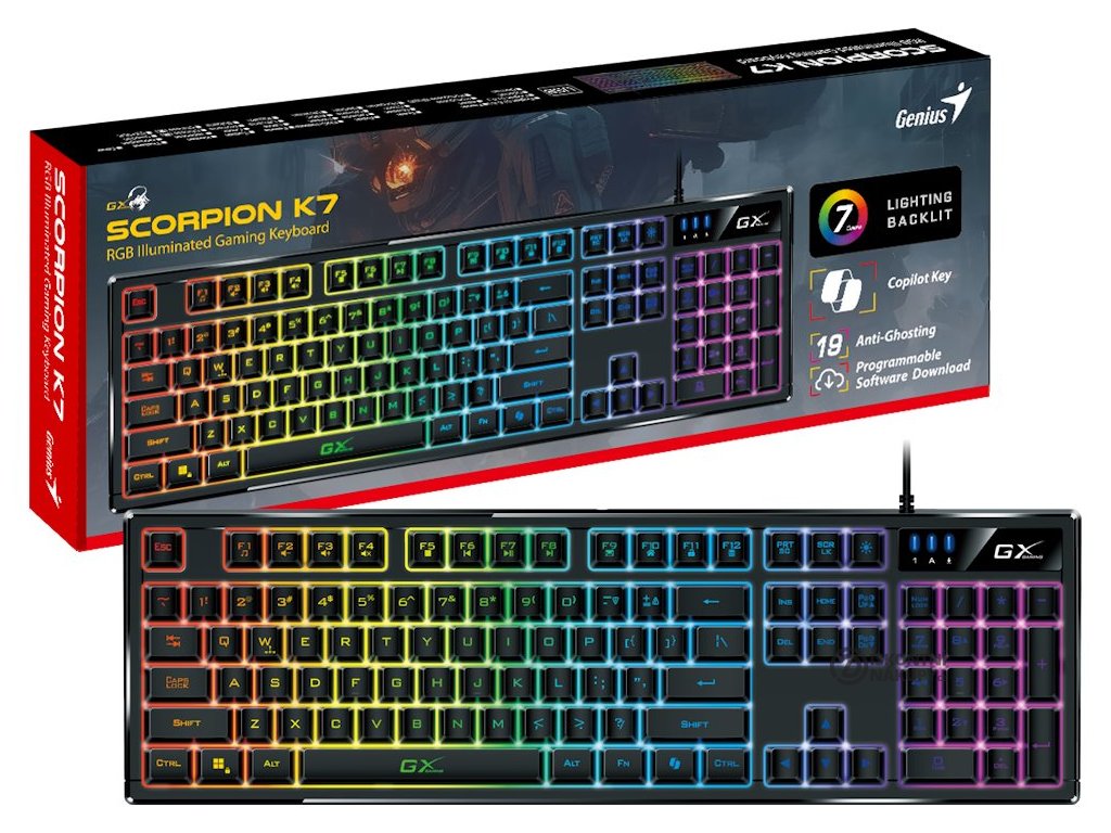 Herní klávesnice Scorpion K7 nabízí programovatelná makro tlačítka a LED podsvícení v sedmi barvách. Samozřejmostí je funkce Anti-ghosting pro 19 kláves, která umožňuje jejich současné stisknutí bez omezení funkčnosti. Zajisté potěší také samostatná klávesa pro vyvolání AI asistenta Windows Copilot (pro Windows 11 a vyšší). Připojení lze jednoduše realizovat skrze 1,8 m dlouhý USB kabel.