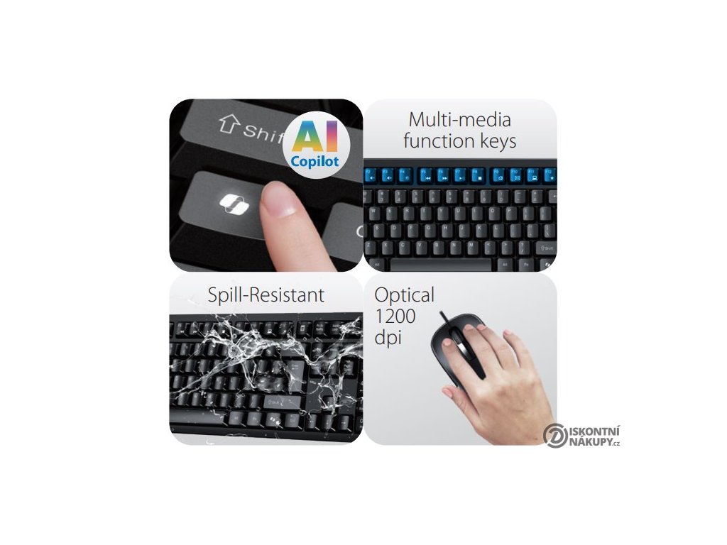 Kvalitní set klávesnice a myši pokryje všechny vaše základní kancelářské potřeby. Klávesnice disponuje klávesou pro vyvolání AI asistenta Microsoft Copilot v systému Windows a řadou programovatelných funkčních kláves, které lze využít pro snadnější ovládání hudebního přehrávače, sociálních sítí či kancelářských programů. Klávesnice je odolná proti polití, takže zůstane funkční i v případě nečekané nehody. Myš je vybavena optickým senzorem s rozlišením snímače 1200 DPI, které zaručí hladké a přesné ovládání.