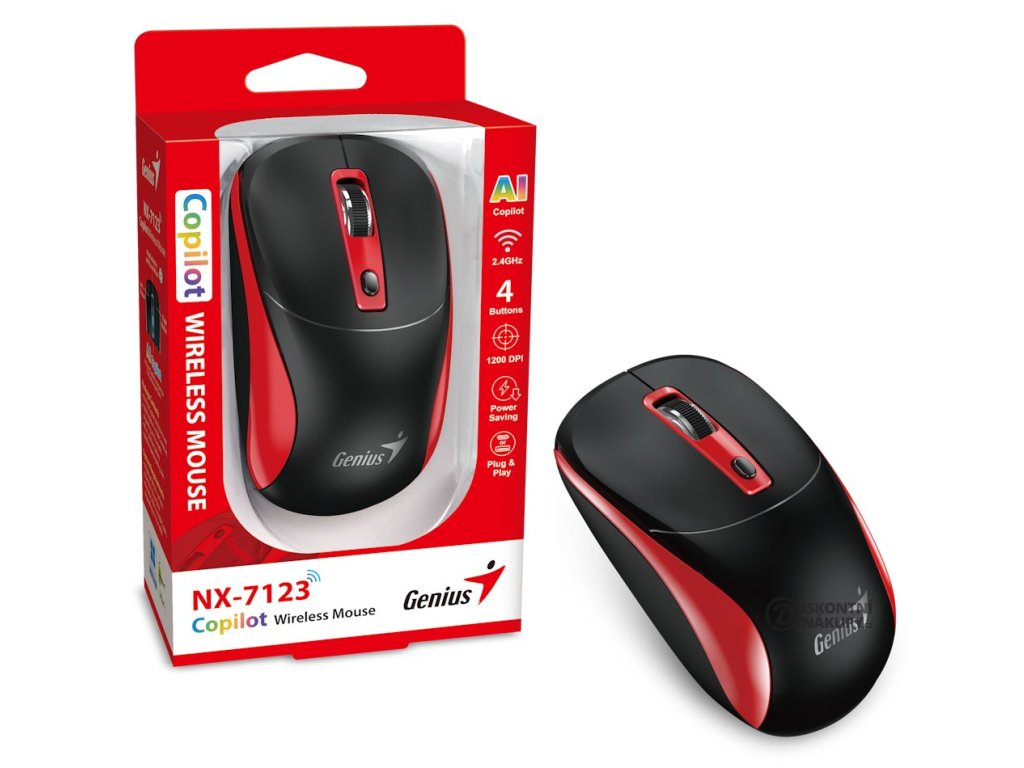 Genius NX-7123Bezdrátová myš disponující optickým senzorem s rozlišením 1200 DPI. Připojení k počítači je realizováno bezdrátově skrze miniaturní USB-A přijímač a rozhraní 2,4 GHz. Myš je vybavena samostatným tlačítkem pro vyvolání AI asistenta Microsoft Copilot (pouze ve Windows 11). Napájení zajišťuje jedna AA baterie. Potěší také přítomnost tlačítka na úsporu energie.