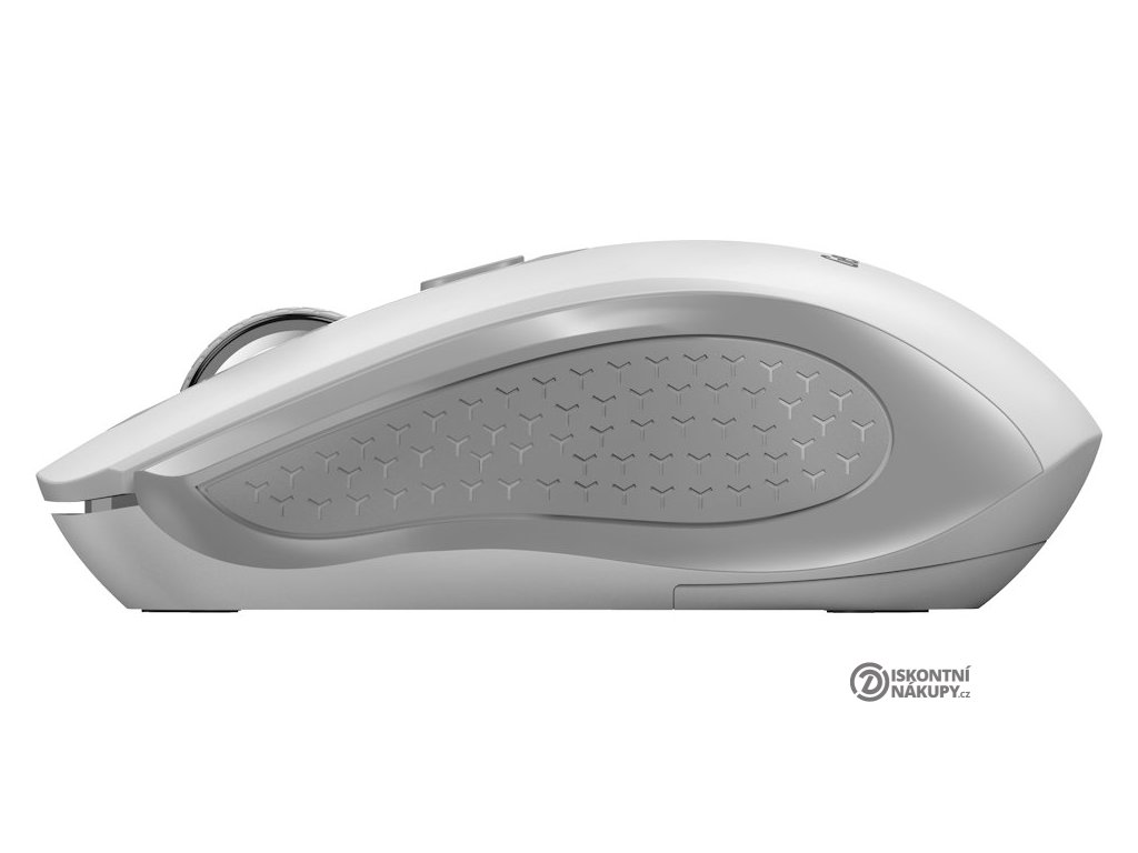 Ergonomický design s mírně zakřivenými boky poskytuje pohodlnou oporu pro palec i prsty při držení. Myš je vhodná pro praváky i leváky a její bezdrátové připojení s dosahem až 10 metrů zajišťuje volnost pohybu bez omezení kabelem.