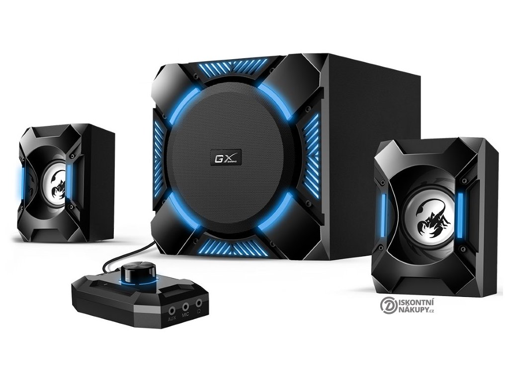 Designové herní reproduktory v konfiguraci 2.1 s celkovým výkonem 36 W. Přítomný zesilovač disponuje ovládáním hlasitosti, díky kterému si můžete užít hlasitý zvuk dle libosti, sluchátkovým výstupem a vstupem pro mikrofon. Herní design doplňuje modré podsvícení.