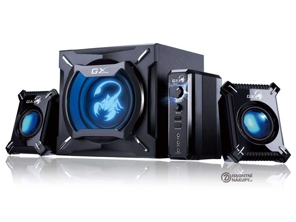 Designové herní reproduktory v konfiguraci 2.1 disponují celkovým výkonem 45 W. Díky přítomnému zesilovači nabízí samostatné ovládání hlasitosti a basů, můžete si tak sami zvolit, na jakou úroveň dunivého zvuku máte akorát náladu. Na předním panelu se nachází také sluchátkový výstup a vstup pro mikrofon. Na zadní straně jsou poté k dispozici konektory pro připojení k počítači, televizoru či DVD přehrávači. Herní design doplňuje modré podsvícení a logo škorpióna na subwooferu.