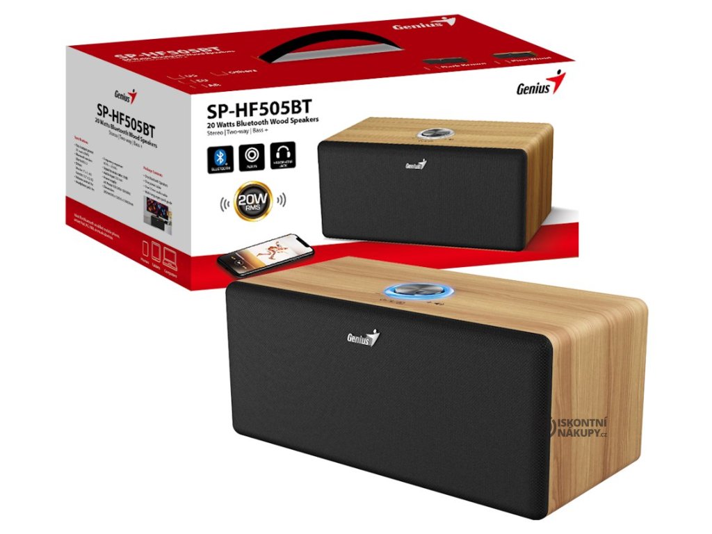 Reproduktor Genius SP-HF505BT se stane ideálním základem vašeho domácího ozvučení. Uplatní se při poslechu hudby, sledování filmů, videí nebo hraní her. Díky dřevěné konstrukci je elegantní na pohled a produkuje přirozený zvuk bez zkreslení, který dosahuje celkového výkonu 20 W RMS. Bezdrátová konektivita skrze technologii Bluetooth vám umožní pohodlné bezdrátové propojení se smartphonem, tabletem nebo notebookem. Samozřejmostí je také přítomnost AUX vstupu pro připojení dalších zařízení či výstup pro sluchátka. Pro ovládání slouží jednoduchý knoflík umístěný na horní straně reproduktoru.