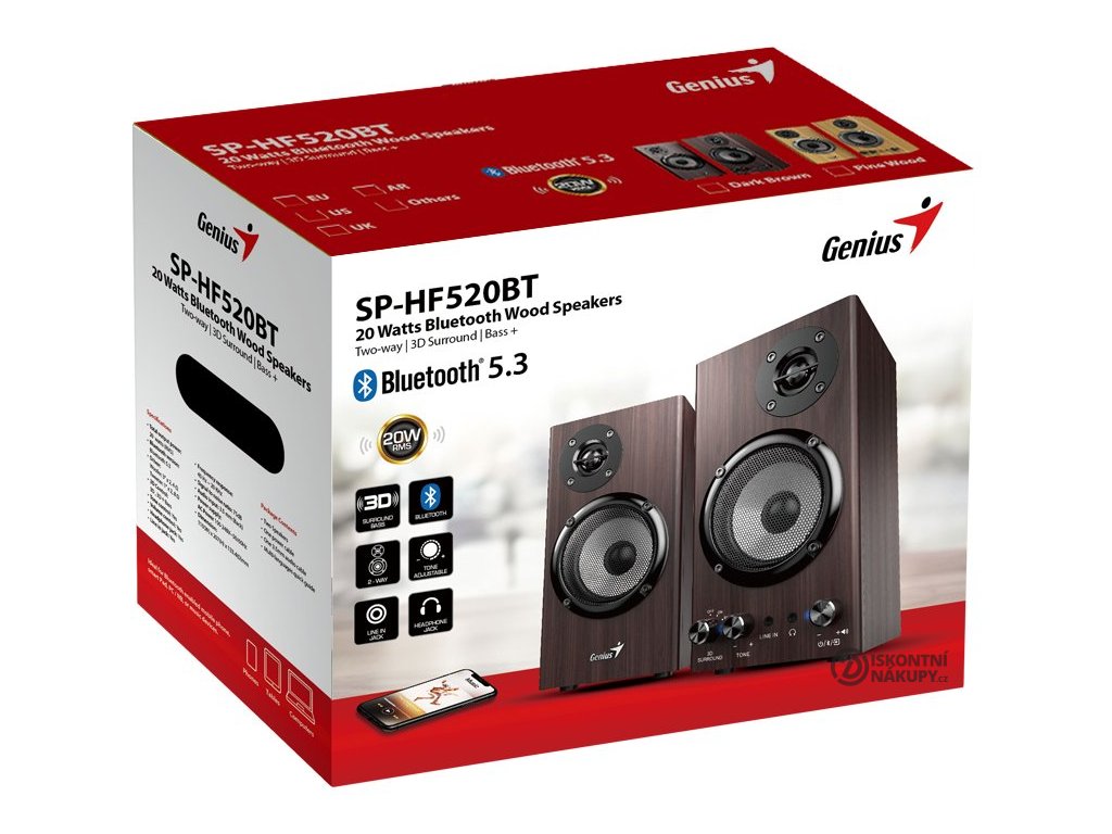 Genius SP-HF520BTSada reproduktorů s 3D prostorovým efektem v konfiguraci 2.0 s celkovým výkonem 20 W. Vyrobeny jsou ze dřeva pro docílení toho nejlepšího zvuku s plnými basy i zřetelnými výškami. Připojení k počítači, notebooku či chytrému telefonu lze jednoduše realizovat drátově skrze 3,5mm konektor či bezdrátově pomocí Bluetooth. K dispozici je také sluchátkový výstup a AUX vstup na přední straně. Potěší ovládání hlasitosti a tónů přímo na reproduktoru.