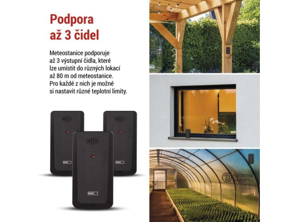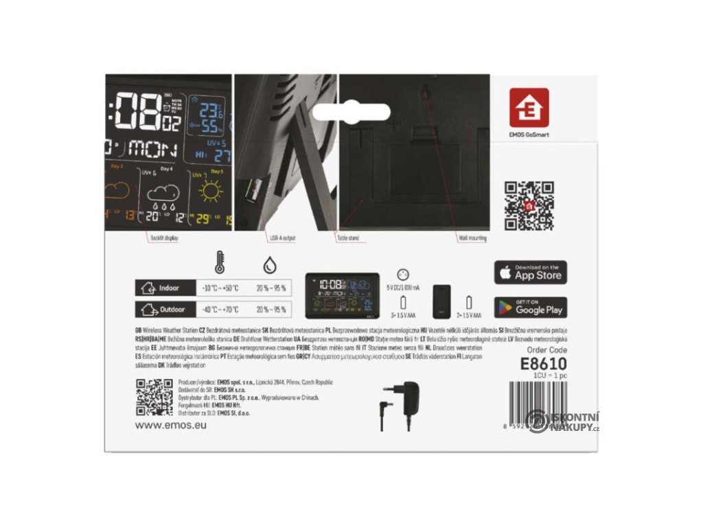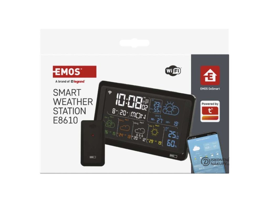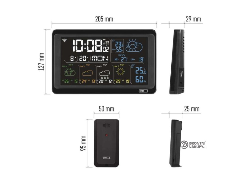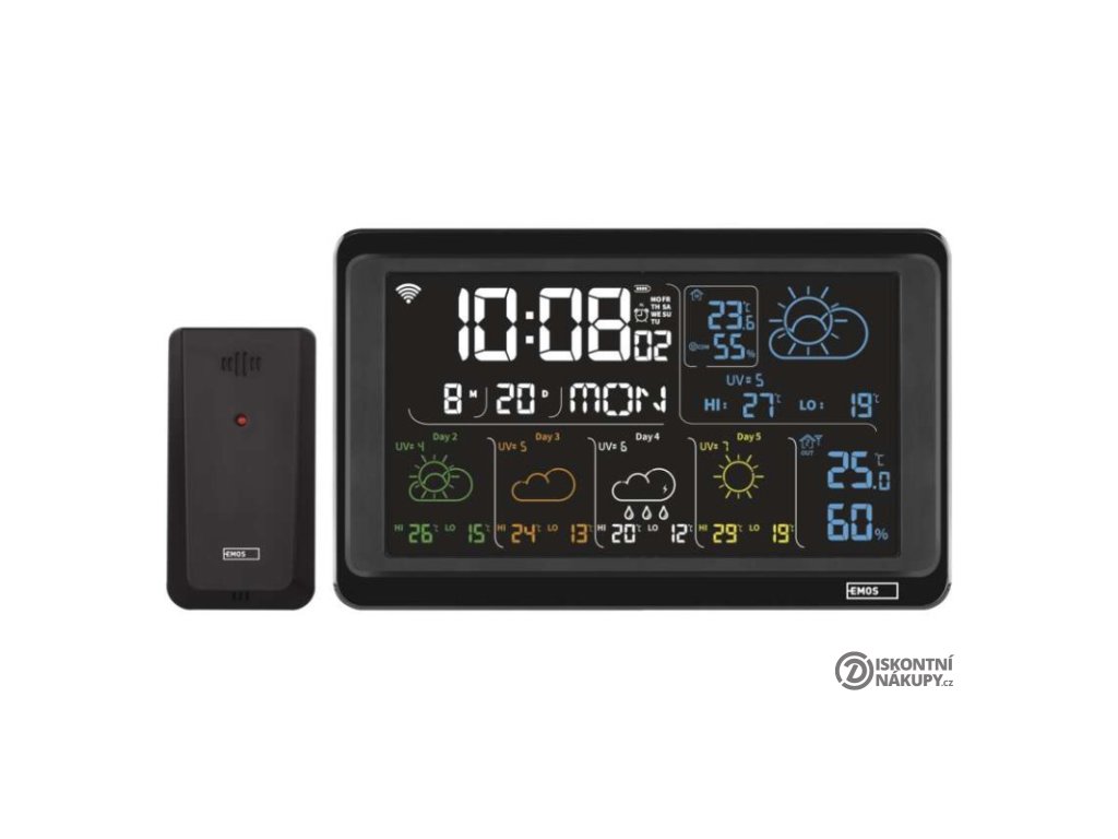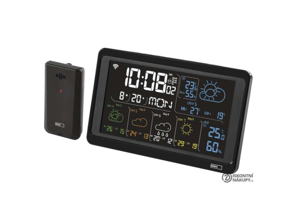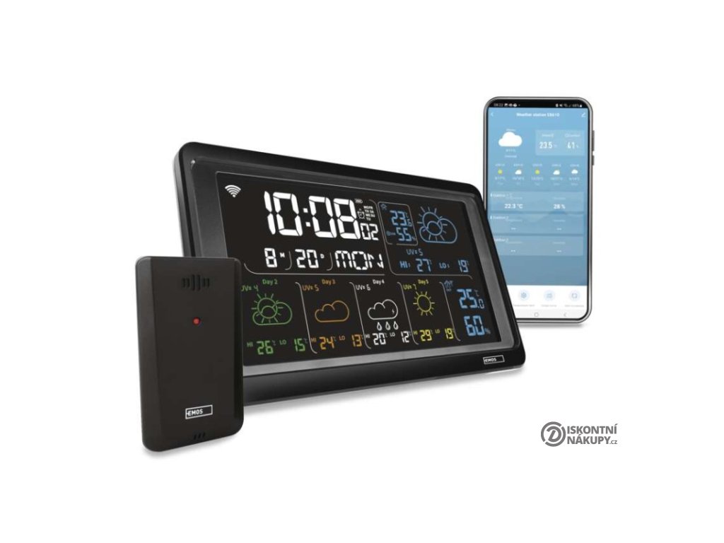 12/24 formát času: ano|anemometr: ne|barevný displej (black mask) podsvícený: ano|barometr: ne|budík: ano|časová pásma: ne|další funkce: USB–A napájecí výstup|datum: ano|dosah čidla: až 80 m|drátová sonda k čidlu: ne|elektronické plošné podsvícení: ano|fáze měsíce: ne|hodiny: řízené wifi|kalendář: ano|kompatibilita: EMOS GoSmart, TUYA, LIDL, Smartlife, Otevřený systém|korekce nadmořské výšky: ne|LED podsvícení displeje: ano|min. a max. teplota: ano|možné další čidlo: až 3 čidla (E00387, E05018)|možnost nastavení jednotky teploty: °C/°F|možnost pověšení na zeď: ano|napájení čidla: 2× 1,5 V AAA (nejsou součástí balení)|napájení stanice: 3× 1,5 V AAA (nejsou součástí balení)|notifikace do mobilní aplikace: ano|opakované buzení: ano|ovládání hlasovými asistenty: ne|podporované OS: Android, iOS|předpověď počasí: ano|přenosová frekvence: 433 MHz|prodejní obal: 1 ks, krabička|produkt: meteostanice|projekce: ne|protokol: Wi-Fi|provedení: bezdrátové – smart|rozměr čidla: 50 × 25 × 95 mm|rozměr hlavní jednotky: 205 × 29 × 127 mm|síťový adaptér: ano, 5 V DC/1 000 mA (součástí balení)|srážkoměr: ne|teplotní výstraha: ano|trend teploty: ano|trend tlaku: ne|trvalé podsvícení: ano|velikost displeje: 169 × 95 mm|venkovní teplota: -40 °C až +70 °C, rozlišení 0,1 °C|venkovní vlhkost: 20 % až 95 % RV, rozlišení 1 %|vnitřní teplota: -10 °C až +50 °C, rozlišení 0,1 °C|vnitřní vlhkost: 20 % až 95 % RV, rozlišení 1 %Popis produktu
