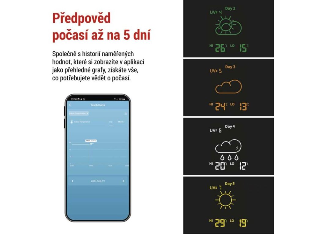TUYA mobilní aplikace.Předpověď na 5 dnů.Možnost připojit max. 3 venkovní čidla.USB výstup pro nabíjení zařízení.