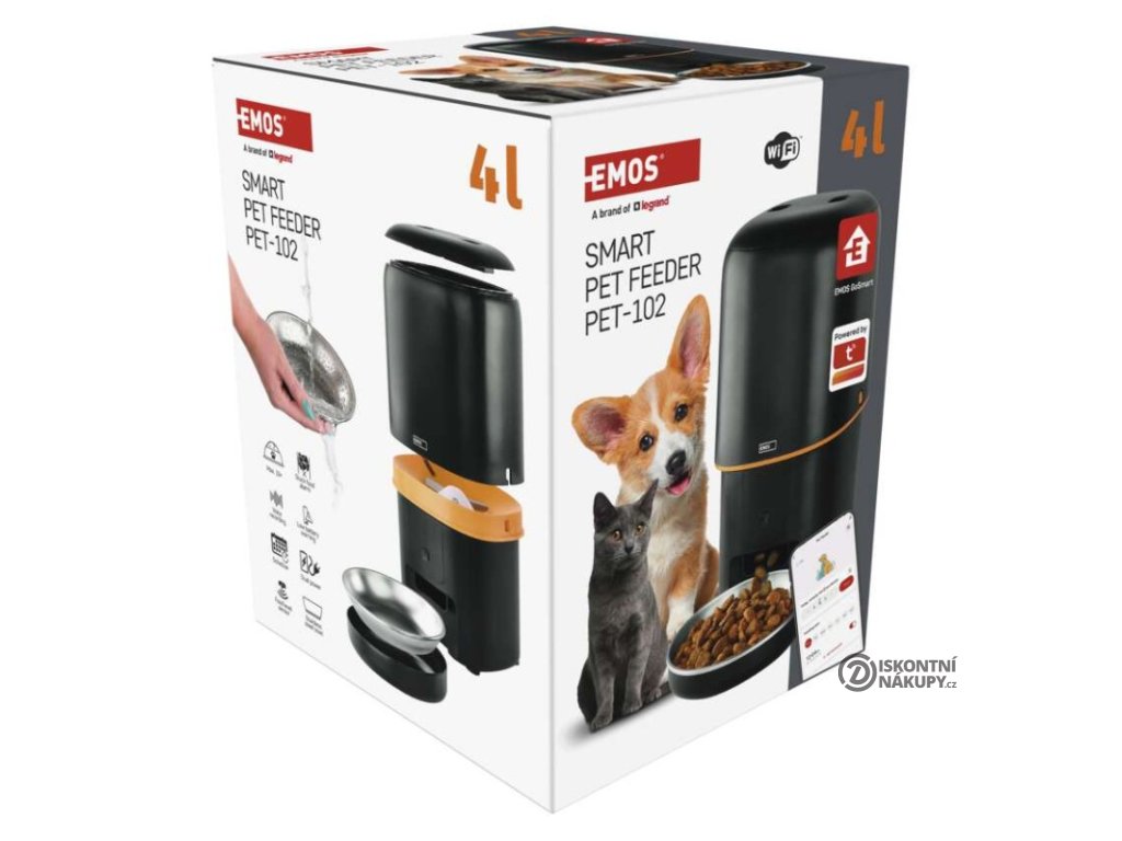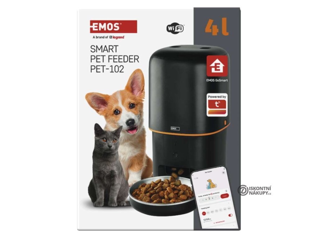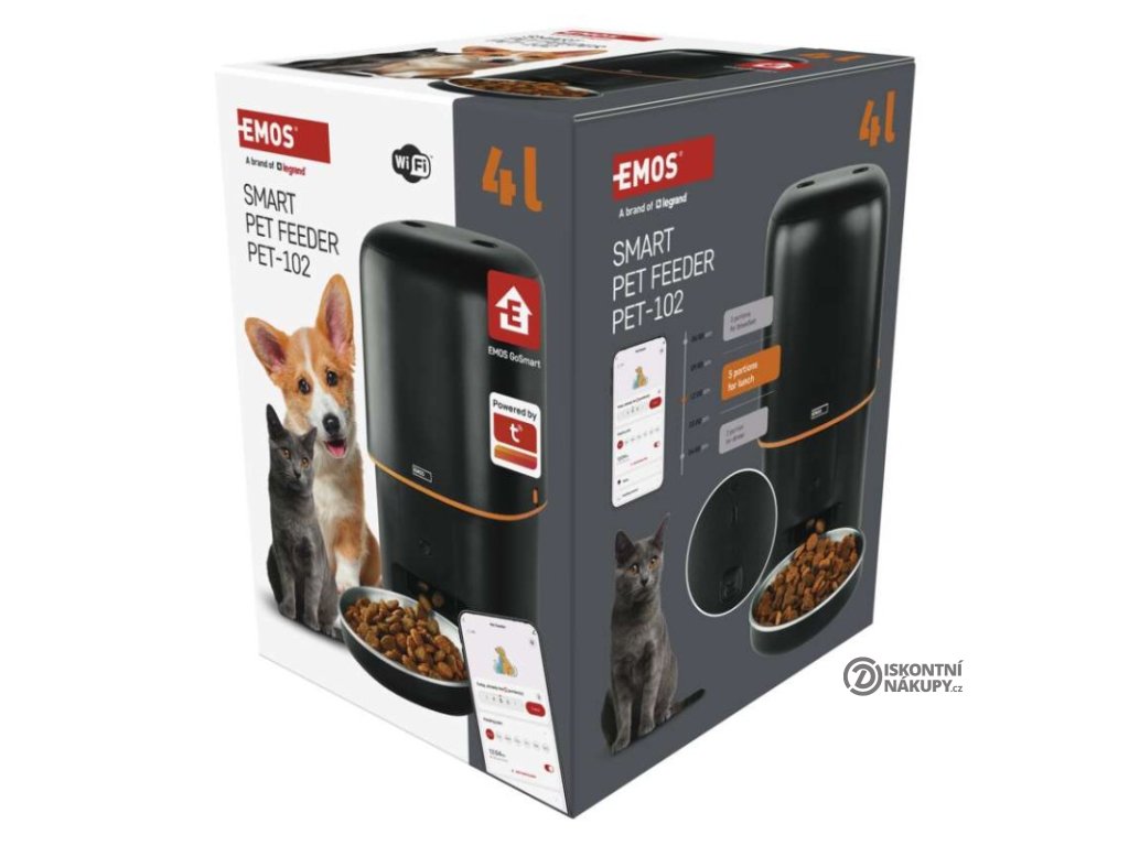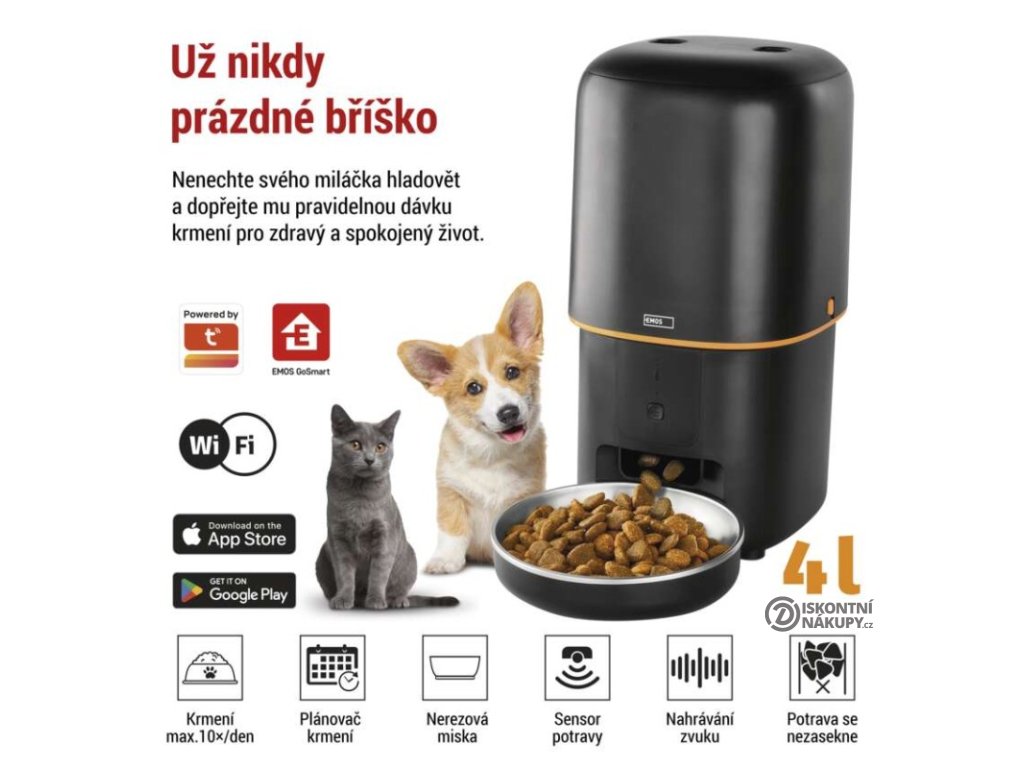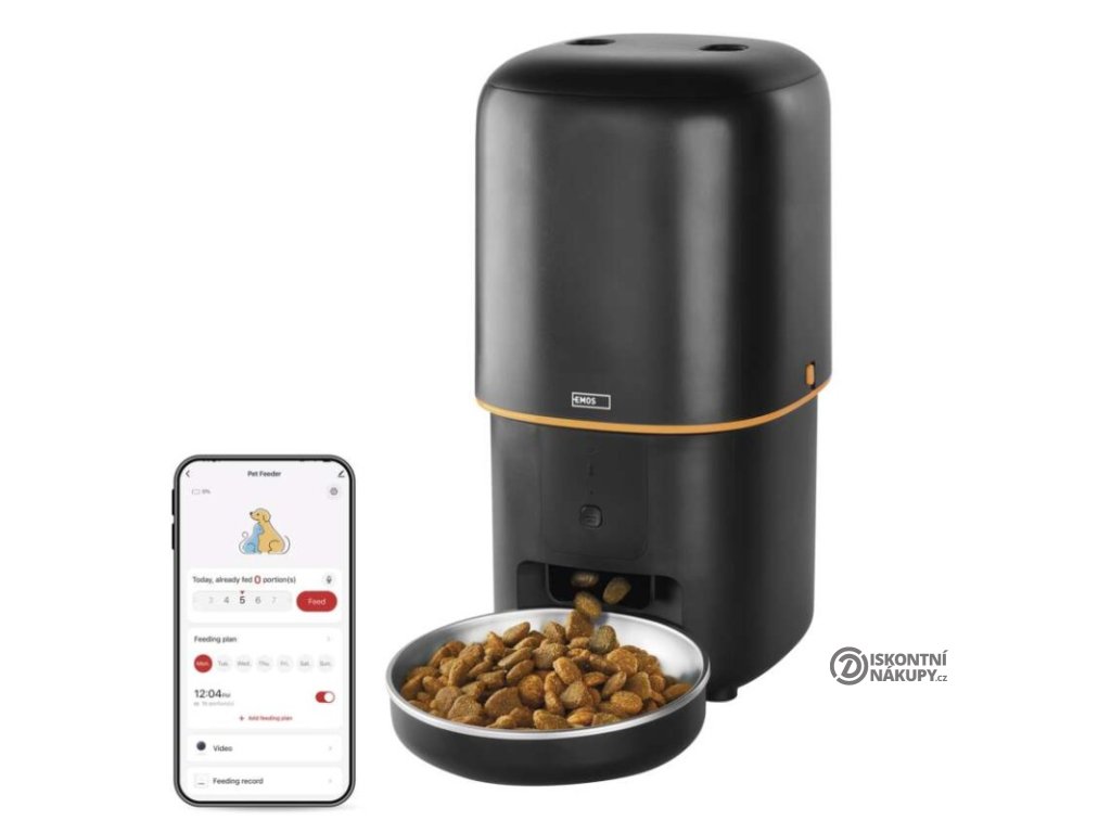barva: černá|další funkce: vyjímatelná nerezová miska|detekce pohybu: –|detekce zvuku: –|doporučení: malá a střední plemena|funkce WebRTC: –|hlasová komunikace: –|instalační materiál: –|IR CUT: –|jazyky aplikace: EN, CZ, SK, PL, DE, HU, SI, FR, + 60 dalších jazyků|jedna porce: 5 g|kapacita: 4 l|kompatibilita: EMOS GoSmart, TUYA, LIDL, Smartlife, Otevřený systém|maximální úhel záběru kamery: –|napájení: 5 V/1 A / 3× 1,5 V typ D|noční vidění: –|notifikace do mobilní aplikace: ano|obsah balení: krmítko, napájecí adaptér, přívodní kabel|ovládání hlasovými asistenty: ne|podporované OS: Android, iOS|přenosová frekvence: 2,4 GHz|prodejní obal: 1 ks, krabice|protokol: Wi-Fi|průměr granulí: 2–15 mm|řada: GoSmart|rozlišení kamery: –|rozměr: 315 × 314 × 168 mm|typ produktu: chytré krmítko|ukládání na cloud: –|ukládání na SD kartu: –|určení: vnitřní|vyvolání hovoru tlačítkem: –|záruční doba: 2 roky|zdroj součástí balení: anoDoplňkové parametry