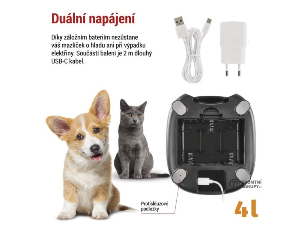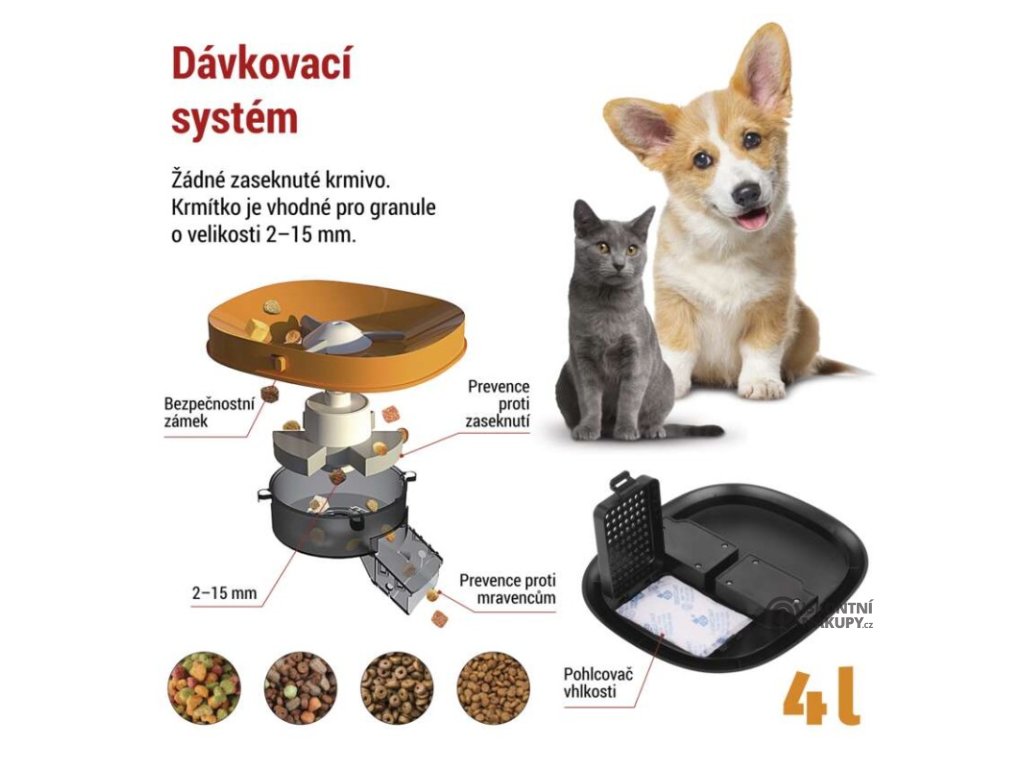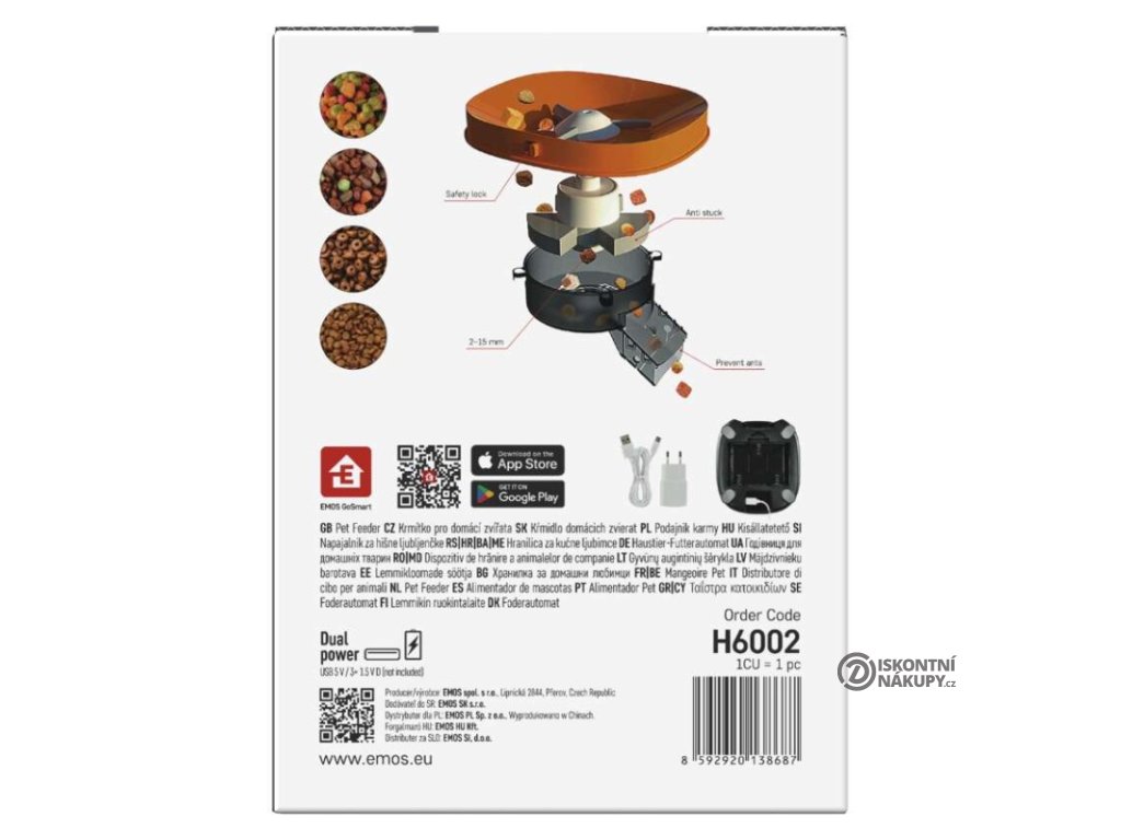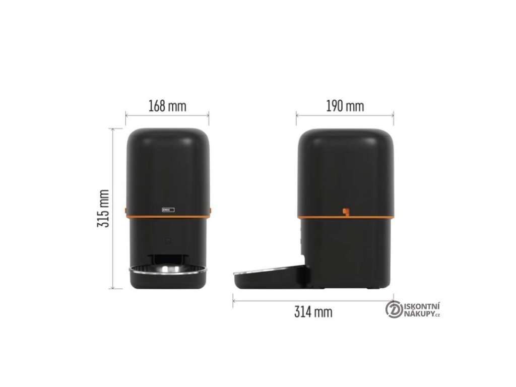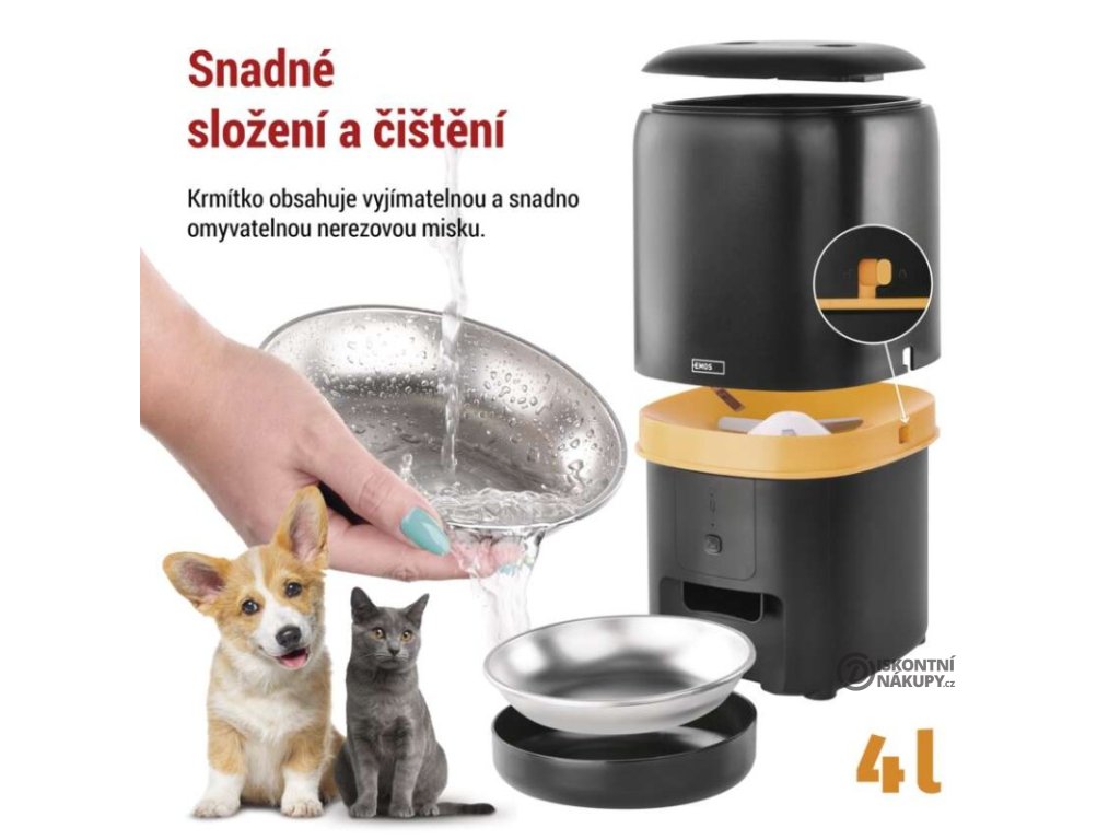 barva: černá|další funkce: vyjímatelná nerezová miska|detekce pohybu: –|detekce zvuku: –|doporučení: malá a střední plemena|funkce WebRTC: –|hlasová komunikace: –|instalační materiál: –|IR CUT: –|jazyky aplikace: EN, CZ, SK, PL, DE, HU, SI, FR, + 60 dalších jazyků|jedna porce: 5 g|kapacita: 4 l|kompatibilita: EMOS GoSmart, TUYA, LIDL, Smartlife, Otevřený systém|maximální úhel záběru kamery: –|napájení: 5 V/1 A / 3× 1,5 V typ D|noční vidění: –|notifikace do mobilní aplikace: ano|obsah balení: krmítko, napájecí adaptér, přívodní kabel|ovládání hlasovými asistenty: ne|podporované OS: Android, iOS|přenosová frekvence: 2,4 GHz|prodejní obal: 1 ks, krabice|protokol: Wi-Fi|průměr granulí: 2–15 mm|řada: GoSmart|rozlišení kamery: –|rozměr: 315 × 314 × 168 mm|typ produktu: chytré krmítko|ukládání na cloud: –|ukládání na SD kartu: –|určení: vnitřní|vyvolání hovoru tlačítkem: –|záruční doba: 2 roky|zdroj součástí balení: anoDoplňkové parametry