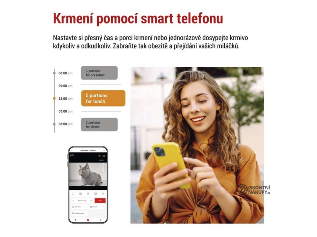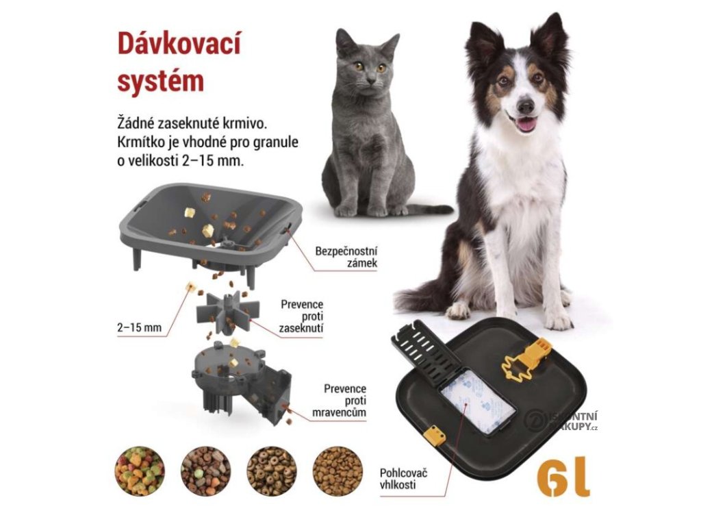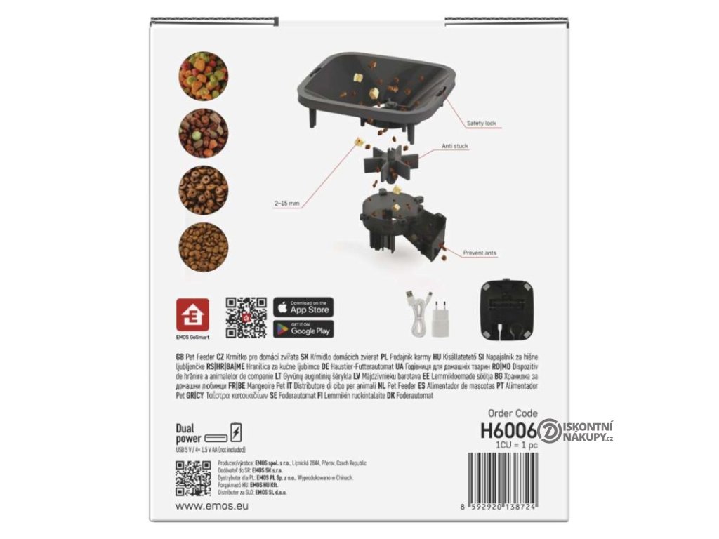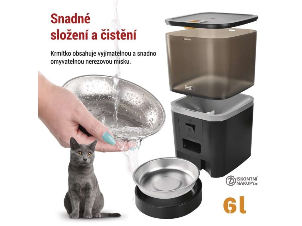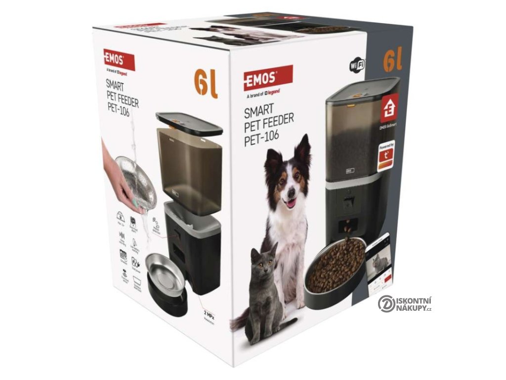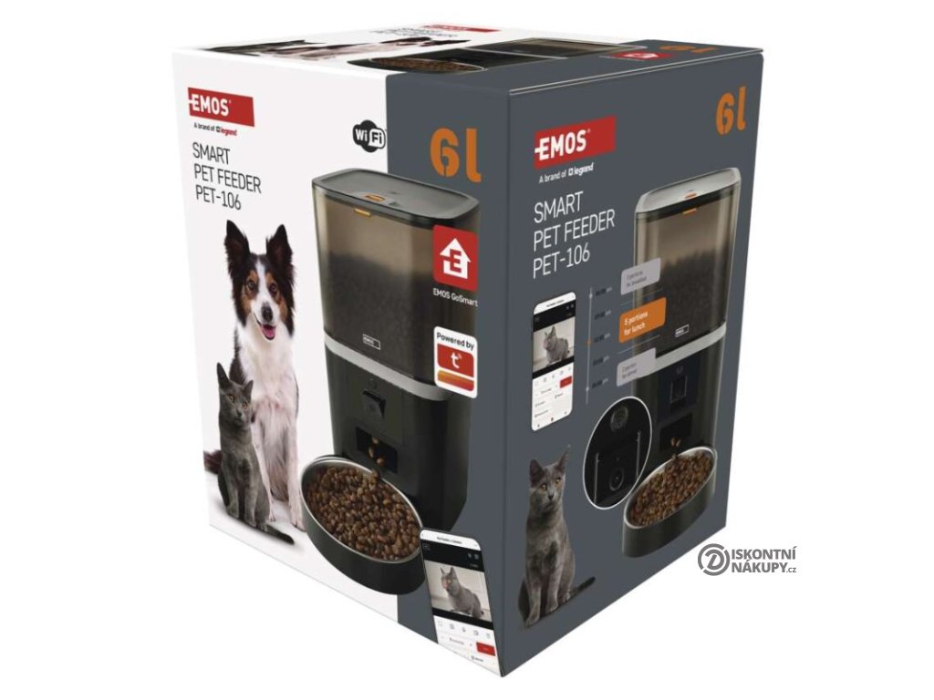 barva: černá|další funkce: vyjímatelná nerezová miska, polohovatelná kamera|detekce pohybu: ano|detekce zvuku: ne|doporučení: střední a větší plemena|funkce WebRTC: ano|hlasová komunikace: ano, obousměrná (Full-Duplex)|instalační materiál: –|IR CUT: ano|jazyky aplikace: EN, CZ, SK, PL, DE, HU, SI, FR, + 60 dalších jazyků|jedna porce: 5 g|kapacita: 6 l|kompatibilita: EMOS GoSmart, TUYA, LIDL, Smartlife, Otevřený systém|maximální úhel záběru kamery: 117°|napájení: 5 V/1 A / 4× 1,5 V typ AA|noční vidění: ano, max. 5 m|notifikace do mobilní aplikace: ano|obsah balení: krmítko, napájecí adaptér, přívodní kabel|ovládání hlasovými asistenty: ne|podporované OS: Android, iOS|přenosová frekvence: 2,4 GHz|prodejní obal: 1 ks, krabice|protokol: Wi-Fi|průměr granulí: 2–15 mm|řada: GoSmart|rozlišení kamery: 1 920 × 1 080|rozměr: 190 × 210 × 325 mm|typ produktu: chytré krmítko s kamerou|ukládání na cloud: ne|ukládání na SD kartu: ne|určení: vnitřní|vyvolání hovoru tlačítkem: ne|záruční doba: 2 roky|zdroj součástí balení: anoDoplňkové parametry
