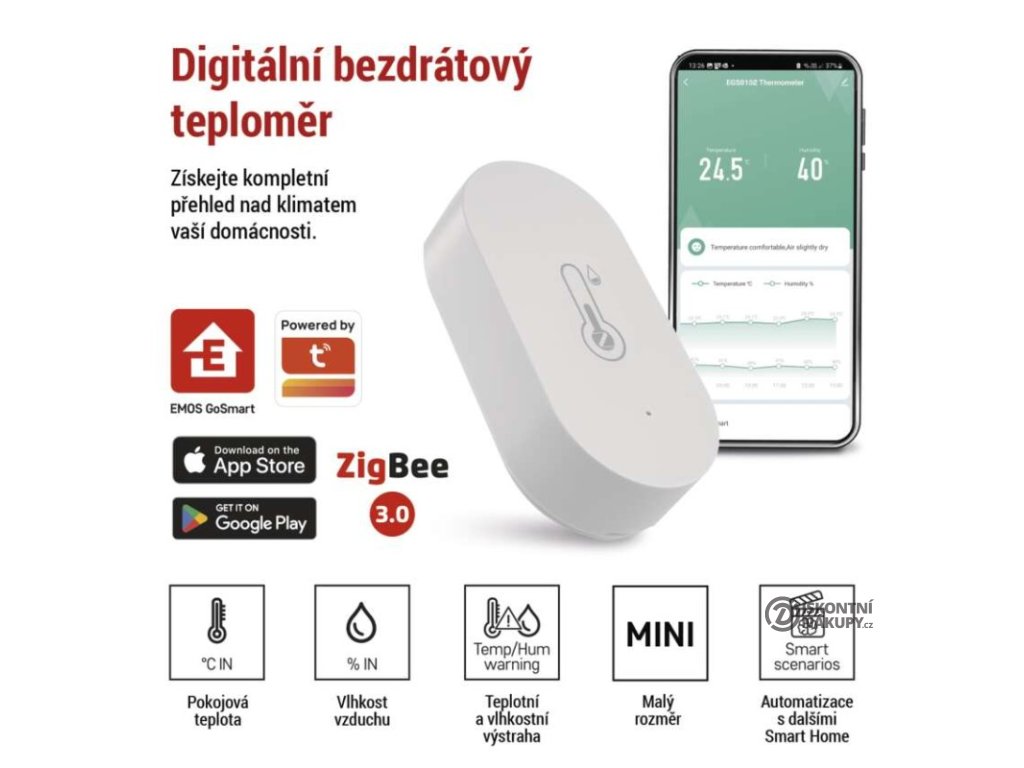 12/24 formát času: ne|barevný displej (black mask) podsvícený: ne|budík: ne|časová pásma: ne|další funkce: –|datum: ne|dosah ve volném prostoru: ne|drátová sonda k čidlu: ne|funkce stopky: ne|hlasová komunikace: –|hodiny: ne|instalační materiál: –|jazyky aplikace: EN, CZ, SK, PL, DE, HU, SI, FR, + 60 dalších jazyků|kalendář: ne|kompatibilita: EMOS GoSmart, TUYA, LIDL, Smartlife, Otevřený systém|LED podsvícení displeje: ne|magnet na připevnění: ne|min. a max. teplota: ne|možné další čidlo: ne|možnost nastavení jednotky teploty: ano|možnost pověšení na zeď: ano|napájení čidla: ne|napájení stanice: 1× 3 V CR2032 (součástí balení)|notifikace do mobilní aplikace: ano|odpočet času max. od: ne|opakované buzení: ne|ovládání hlasovými asistenty: ano (Amazon Alexa, Google Assistant)|paměť poslední hodnoty: ne|podporované OS: Android, iOS|přenosová frekvence: ne|prodejní obal: 1 ks, krabička|protokol: Zigbee 3.0|provedení teploměru: bezdrátové – smart|rozměr čidla: ne|rozměr hlavní jednotky: 26 × 13 × 52 mm|síťový adaptér: ne|teplotní index: ne|teplotní výstraha: ano|trend teploty: ne|trend tlaku: ne|trvalé podsvícení: ne|velikost displeje: ne|venkovní teplota: ne|venkovní vlhkost: ne|vnitřní teplota: -20 °C až +60 °C, rozlišení 0,1 °C|vnitřní vlhkost: 0 % až 99 % RV, rozlišení 1 %Popis produktu