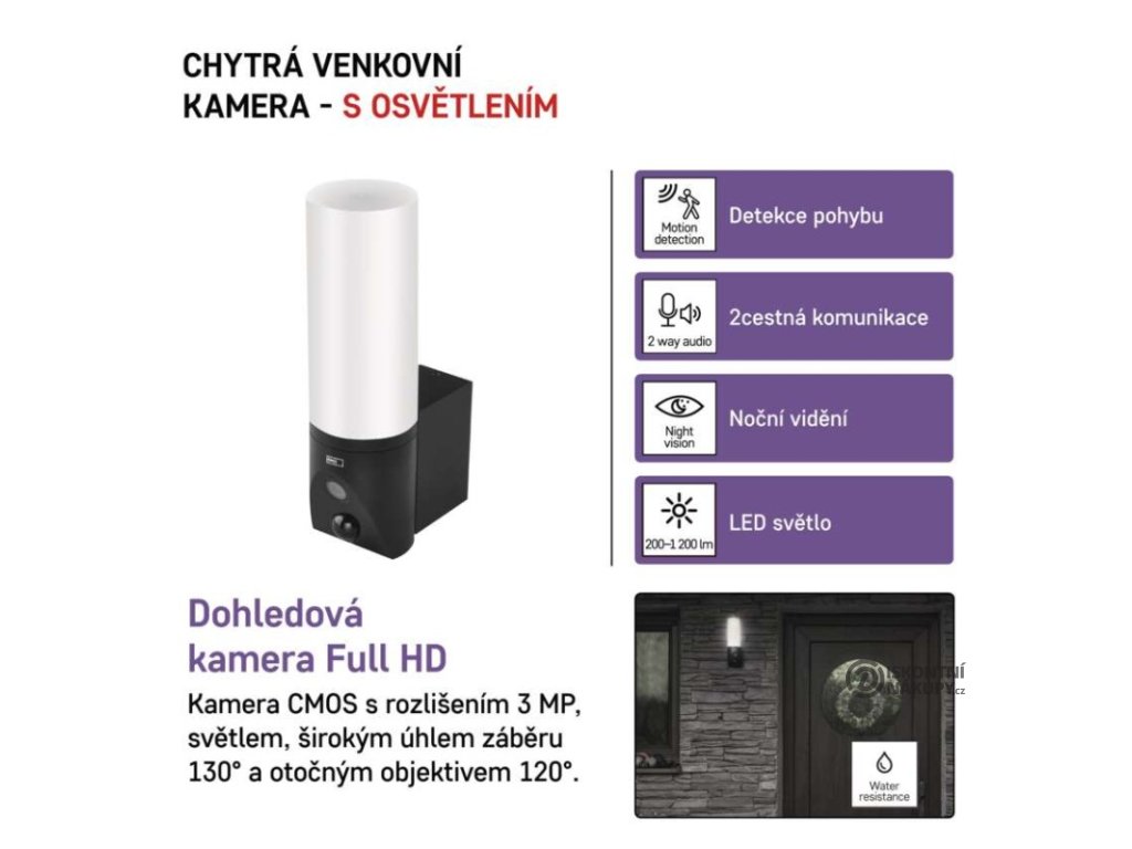 automatické ukládání snímků: ano|barva: černá|další funkce: –|detekce pohybu: ano|detekce zvuku: ne|dosah detekce pohybu: 10 metrů|funkce WebRTC: ano|hlasová komunikace: obousměrná|hloubka: 131 mm|instalační materiál: ano|IR CUT: ne|jazyky aplikace: EN, CZ, SK, PL, DE, HU, SI, FR, + 60 dalších jazyků|kompatibilita: EMOS GoSmart, TUYA, LIDL, Smartlife, Otevřený systém|krytí: IP65|maximální dosvit nočního vidění: 10 metrů|maximální úhel záběru kamery: 130°|montáž: na stěnu|motorizované otáčení: ano|napájení kamery: AC 100~240 V|nastavení oblasti detekce: ano|noční vidění: ano, 4× IR LED + bílá LED|notifikace do mobilní aplikace: ano|obsah balení: 1× kamerová jednotka, 1× instalační materiál, 1× manuál|ochrana proti odcizení: blokováno aplikací|ovládání hlasovými asistenty: ano (Amazon Alexa, Google Assistant)|podpora ONVIF: ano|podporované OS: Android, iOS|přenosová frekvence: 2,4 GHz WIFI|přídavné LED světlo: ano|přídavný vnitřní monitor: ne|prodejní obal: 1 ks, krabice|protokol: Wi-Fi|řada: GoSmart|rozlišení kamery: 2 304 × 1 296|rozpoznání lidského těla: ne|rozpoznání zvířete: ne|siréna: ano|šířka: 74 mm|sledování pohybu (tracking): ano|snímací prvek kamery: 1/2.8‘‘ 3 Megapixel CMOS|soukromý (privátní) mód: ne|typ držáku: základní|typ produktu: IP kamera|úhel detekce pohybu: 120°|ukládání na cloud: ano|ukládání na SD kartu: ano|výdrž baterie: –|výška: 260 mm|vyvolání hovoru tlačítkem: ne|záruční doba: 2 roky|zdroj součástí balení: neDoplňkové parametry