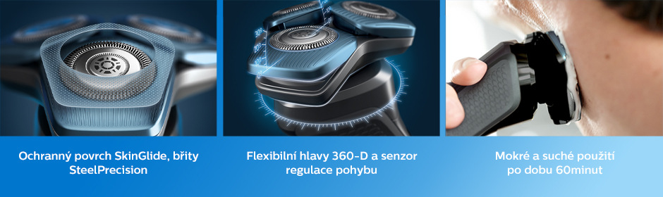 Unikátní konstrukce holicího strojku Philips Series 7000 umožňuje perfektně kopírovat jedinečné tvary vašeho obličeje a přizpůsobovat se jim. Flexibilní hlavy přístroje se otáčí o 360° a zajišťují dokonale hladké oholení bez podráždění.
