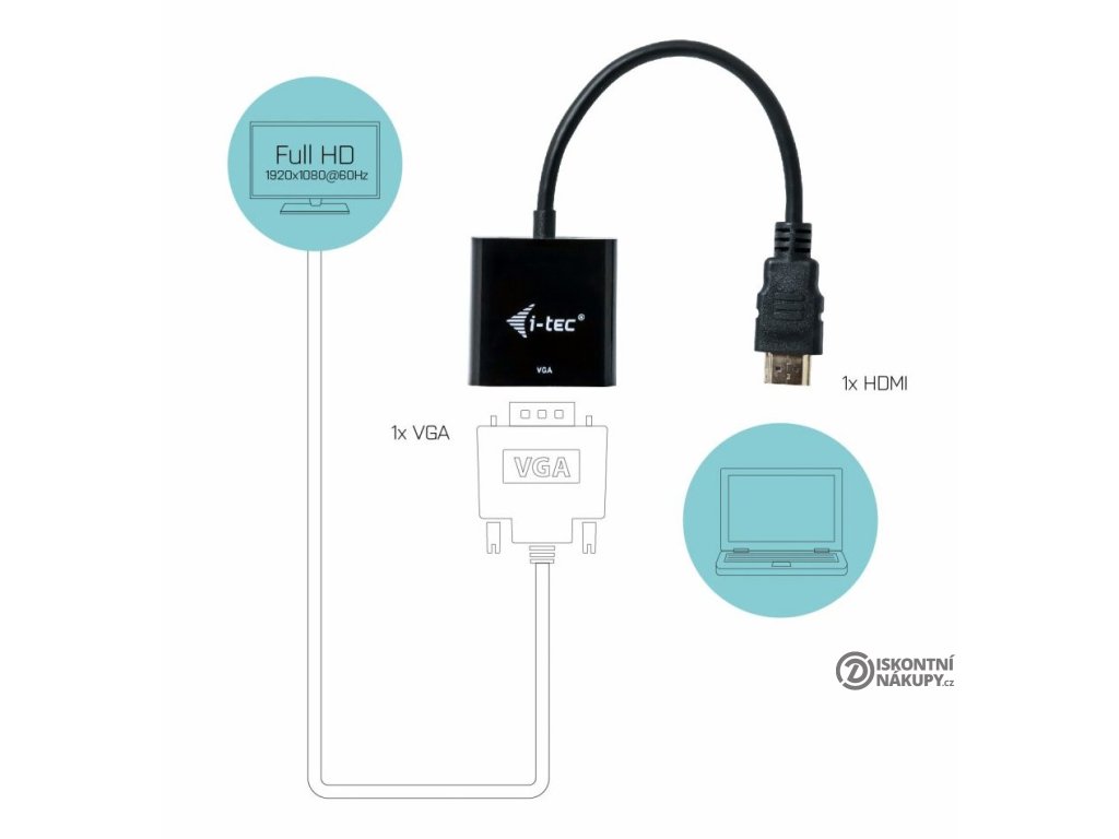I-TEC HDMI na VGAS tímto adaptérem získáte VGA (F) port z HDMI (M) portu, můžete tak rozšířit svou pracovní plochu např. o externí VGA monitor. Adaptér umožňuje přenášet video v rozlišení až 1920 × 1080 pixelů při 60 Hz. Použití je velmi jednoduché, kabelový adaptér pouze připojíte do HDMI portu počítače, pomocí VGA konektoru jej propojíte se zobrazovacím zařízením a můžete začít okamžitě využívat. Instalace ovladačů je automatická ze systému.