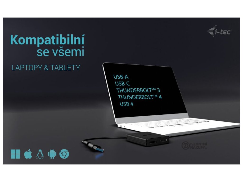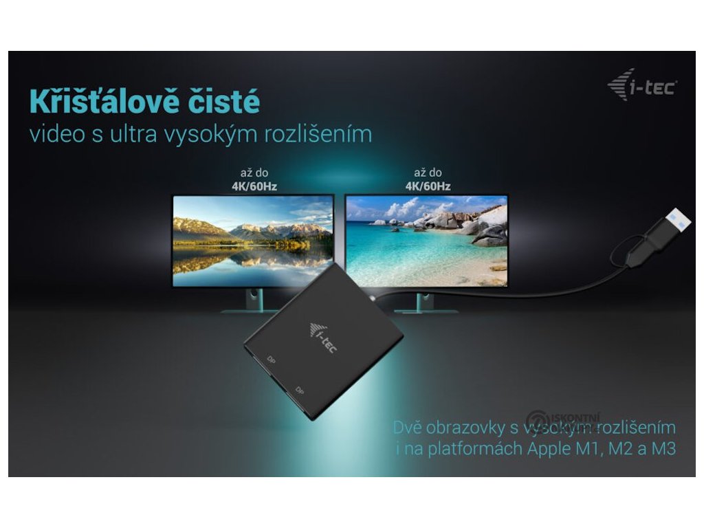 I-TEC USB-A/USB-C Dual 4K DisplayPortVideo adaptér, který umožňuje rozšíření vaší pracovní plochy o dva externí DisplayPort monitory. Připojení lze jednoduše realizovat skrze konektor USB-A či USB-C s podporou USB 4.0 a Thunderbolt 3/4. Adaptér podporuje přenos rozlišení 4K při 60 Hz včetně zvukového signálu.
