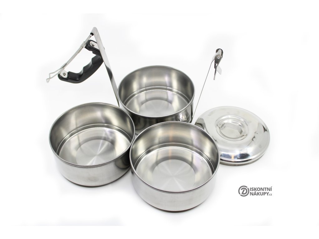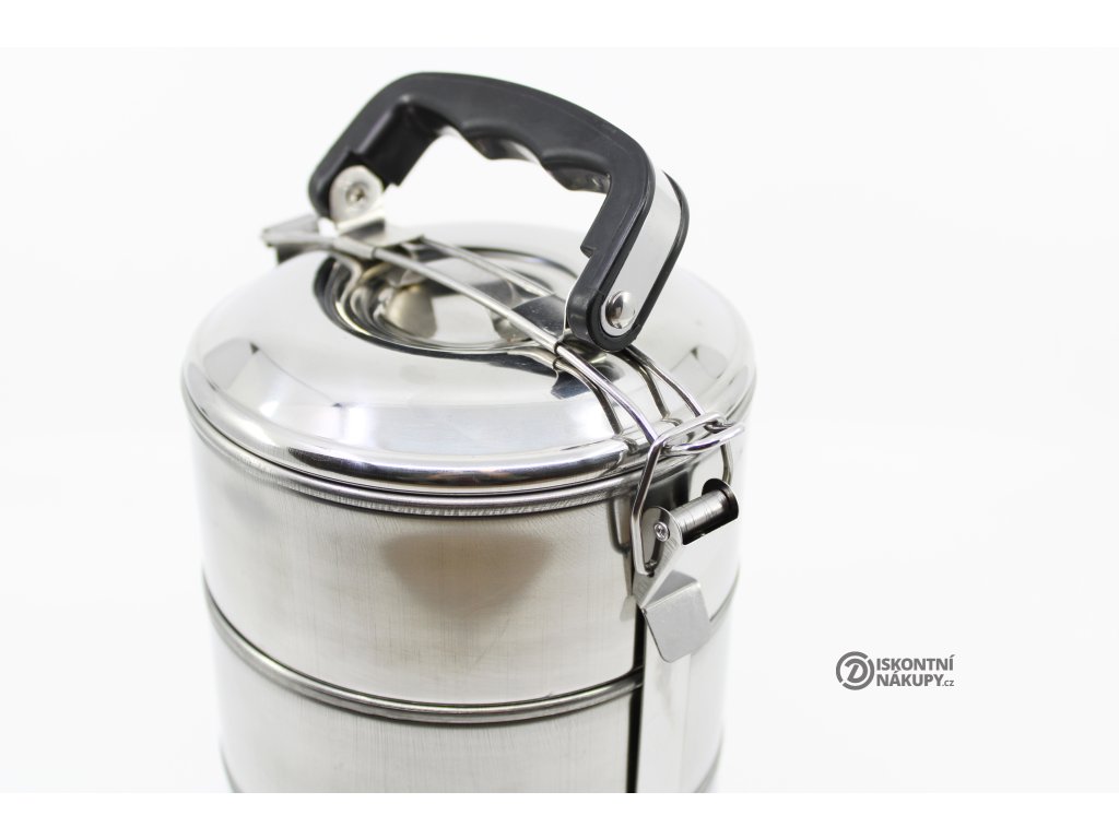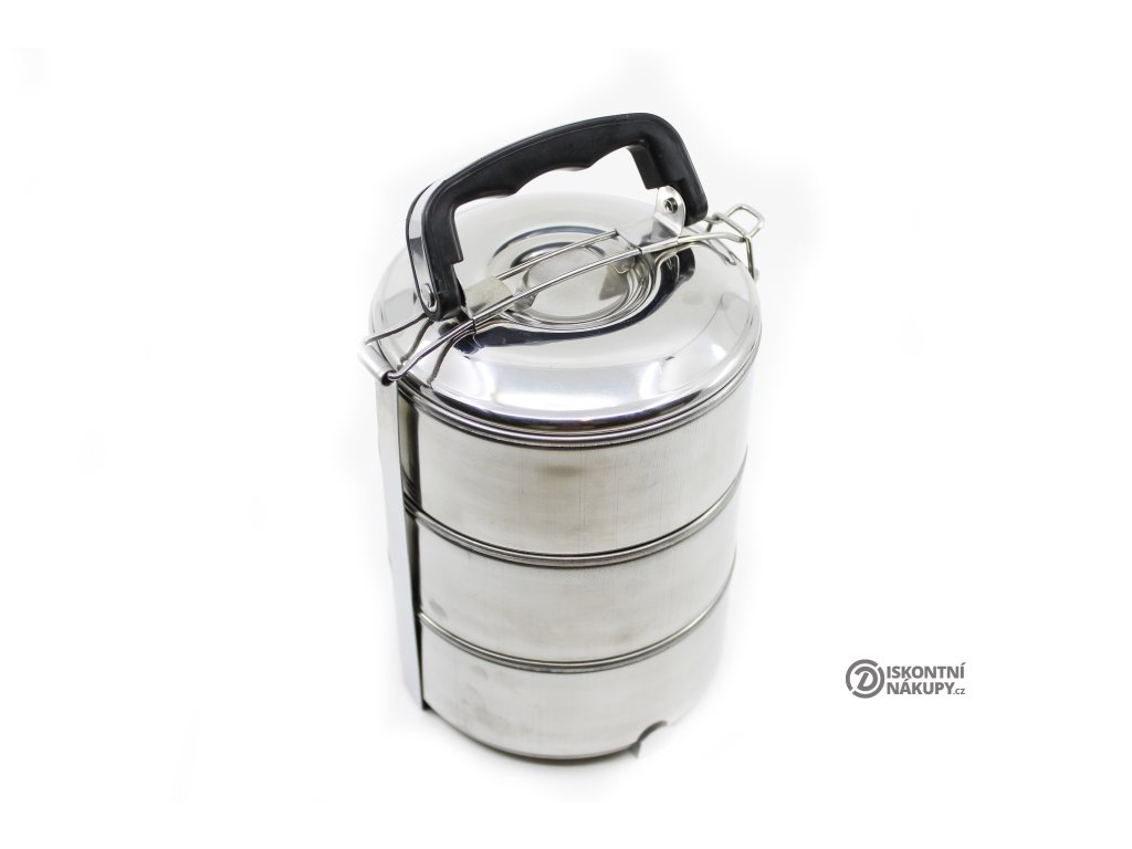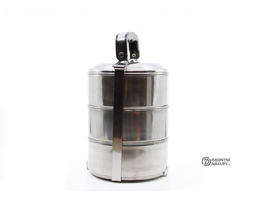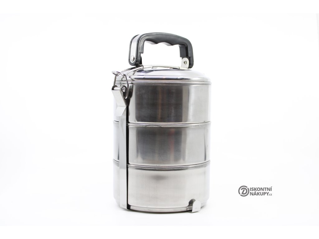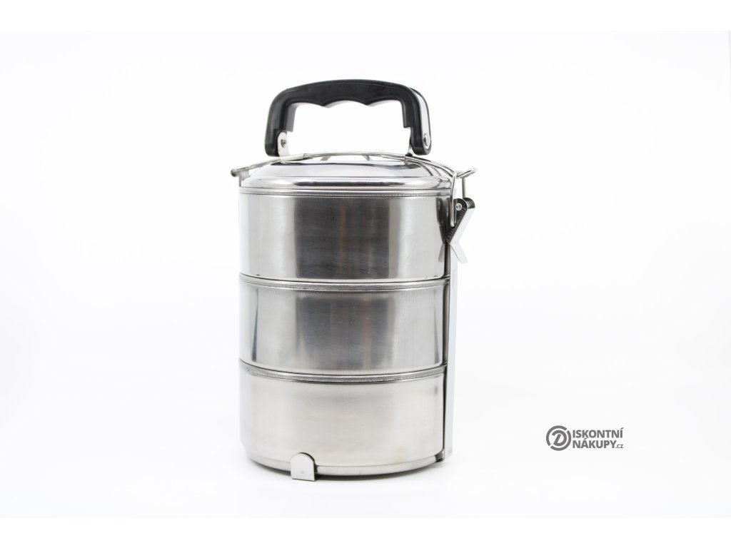 Kvalitní 3-patrový nerezový jídlonosič s robustním úchytem pro snadné přenášení.