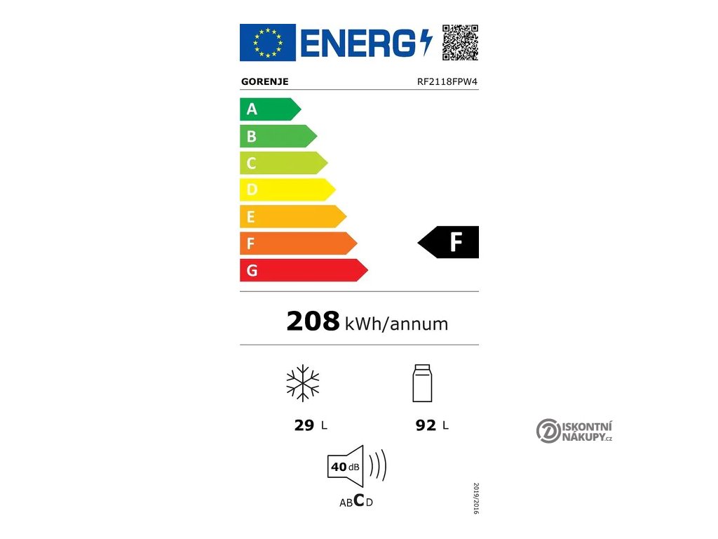 Kombinovaná lednice s mrazákem nahoře Gorenje RF2118FPW4Kombinovaná lednice s mrazákem nahoře Gorenje RF2118FPW4 se stane nedílnou součástí vaší domácnosti. Svou energetickou třídou se řadí do kategorie F, která ušetří vaše finance a životní prostředí. Celkový objem chladící části je 92 l a mrazák pojme 29 l. Maximální hlučnost chladničky dosahuje 40 dB, takže vás nebude nijak vyrušovat. |