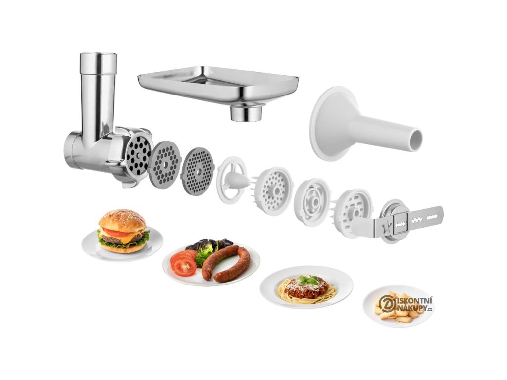 Sencor dopřál tomuto kuchyňskému robotu nejrůznější nástavce na mlýnek. V prvé řadě masomlýnek, s jehož asistencí umelete maso na oblíbený tatarák, hovězí do burgerů či směs do boloňských špaget. Spolu s jiným nástavcem zas naplníte uzeniny dle libosti.