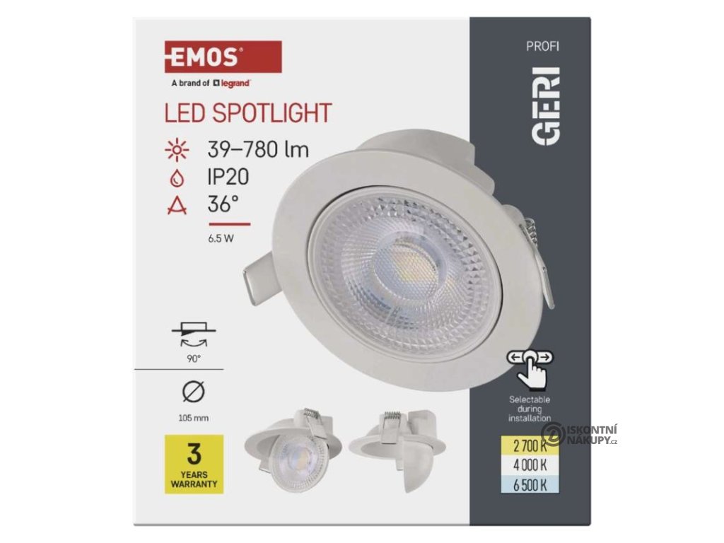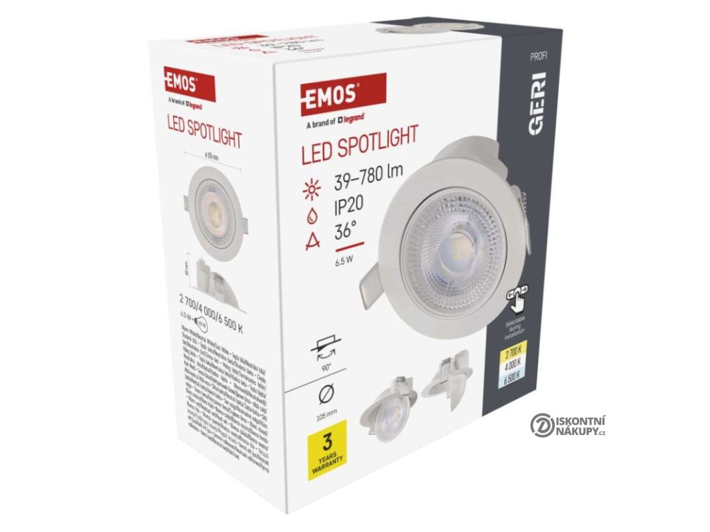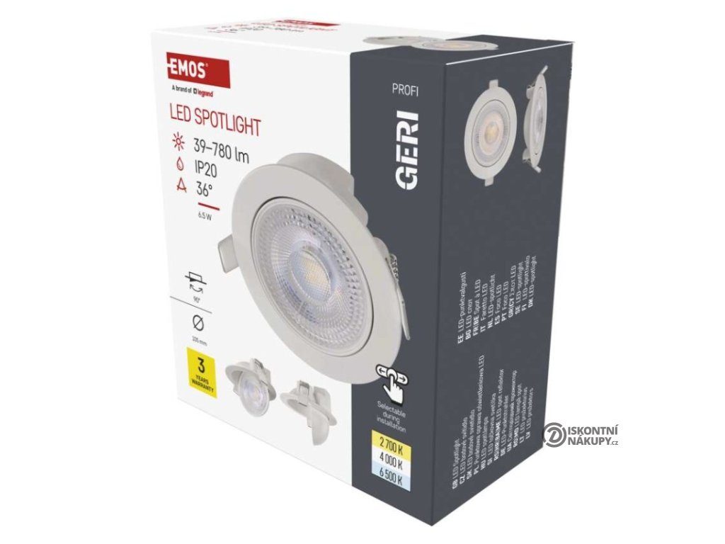 barva světla: teplá/neutrální/studená bílá|barva těla: bílá|dálkový ovladač: ne|další funkce: –|do chodby a na schodiště: ano|do dílny a garáže: ne|do kanceláře: ano|do koupelny: ne|do kuchyně: ano|do obýváku, ložnice a dětského pokoje: ano|dosah senzoru: neuvádí se|flicker-free: ano|frekvence: 50/60 Hz|index podání barev (CRI): Ra > 80|jazyky aplikace: –|kategorie: PROFI|kompatibilita: –|krytí: IP20|materiál difuzoru: plast (PC)|materiál LGP: neuvádí se|materiál těla: hliník|montážní otvor: 87 mm|možnost stmívání: ano – Triac|náhrada za žárovku: 60 W|napětí: 220–240 V~|na zahradu a balkon: ne|notifikace do mobilní aplikace: ne|obsah balení: –|ovládání hlasovými asistenty: ne|podporované OS: –|pohybový senzor: ne|přenosová frekvence: –|příkon: 6,5 W|prodejní obal: 1 ks, krabice|protokol: –|proud: 150 mA|řada: GERI|rozměr: průměr 105 × 40 mm|světelná účinnost: 120 lm/W|světelný tok: 780 lm|teplota chromatičnosti: 2 700/4 000/6 500 K|tvar: kruh|typ difuzoru: mikroprizmatický|typ svítidla: klasické svítidlo|účiník: > 0,7|UGR<: neuvádí se|úhel vyzařování: 36°|umístění: stropní|výstupní proud ze zdroje: neuvádí se|záruční doba: 3 roky|zdroj světla: LED|životnost: 30 000 hodin|způsob montáže: vestavnéDoplňkové parametry