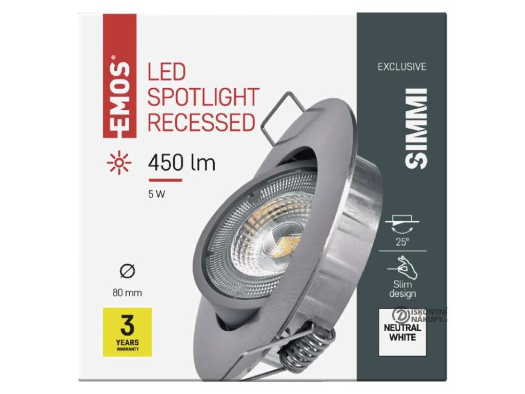 barva světla: neutrální bílá|barva těla: broušený nikl|dálkový ovladač: ne|do chodby a na schodiště: ano|do dílny a garáže: ne|do kanceláře: ne|do koupelny: ne|do kuchyně: ano|do obýváku, ložnice a dětského pokoje: ano|dosah senzoru: nemá senzor|flicker-free: ano|frekvence: 50/60 Hz|index podání barev (CRI): Ra > 80|kategorie: EXCLUSIVE|krytí: IP20|materiál difuzoru: plast (PC)|materiál LGP: neuvádí se|materiál těla: hliník|montážní otvor: 68 mm|možnost stmívání: ne|náhrada za žárovku: 50 W|napětí: 230 V|na zahradu a balkon: ne|pohybový senzor: ne|příkon: 5 W|prodejní obal: 1 ks, krabice|proud: 35 mA|řada: SIMMI|rozměr: průměr 80 × 25 mm|světelná účinnost: 90 lm/W|světelný tok: 450 lm|teplota chromatičnosti: 4 000 K|tvar: kruh|typ difuzoru: čirý|typ svítidla: bodovka|účiník: > 0,5|UGR<: neuvádí se|úhel vyzařování: 110°|umístění: stropní|výstupní proud ze zdroje: neuvádí se|záruční doba: 3 roky|zdroj světla: LED|životnost: 25 000 hodin|způsob montáže: vestavnéPopis produktu