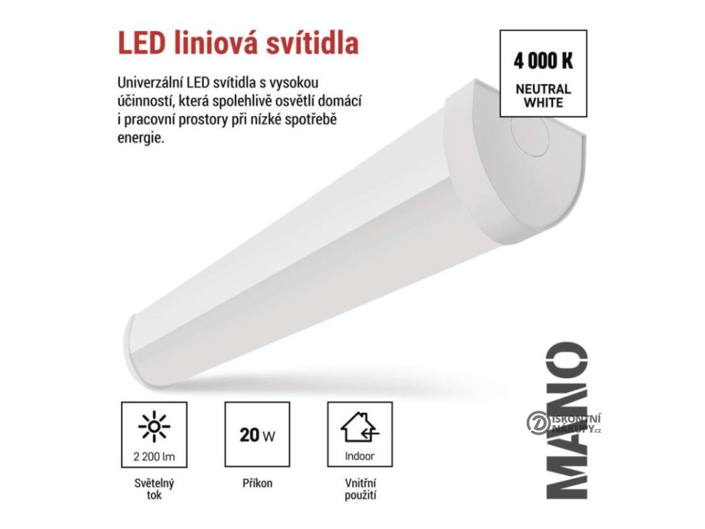 barva světla: neutrální bílá|barva těla: bílá|frekvence: 50/60 Hz|index podání barev (CRI): Ra >80|krytí: IP20|materiál: plast (PC)|materiál difuzoru: plast (PC)|materiál spon: nemá spony|materiál těla: plast (PC)|možnost stmívání: ne|náhrada za žárovku: neuvádí se|napětí: 220–240 V~|příkon: 20 W|prodejní obal: 1 ks, blistr|proud: 150 mA|průběžná montáž: neuvádí se|rozměr: 600 × 62 × 55 mm|rozsah pracovní teploty: -20 °C až +40 °C|stupeň ochrany proti mechanickým nárazům: IK06|světelný tok: 2 200 lm|světelný tok v nouzovém režimu: neuvádí se|teplota chromatičnosti: 4 000 K|třída ochrany: II|typ difuzoru: mléčný|typ montáže: přisazená|typ řízení: neuvádí se|úhel vyzařování: 120°|výdrž baterie: neuvádí se|záruční doba: 2 roky|záruka na baterii: neuvádí se|zdroj světla: LED|životnost: 25 000 hodinDoplňkové parametry