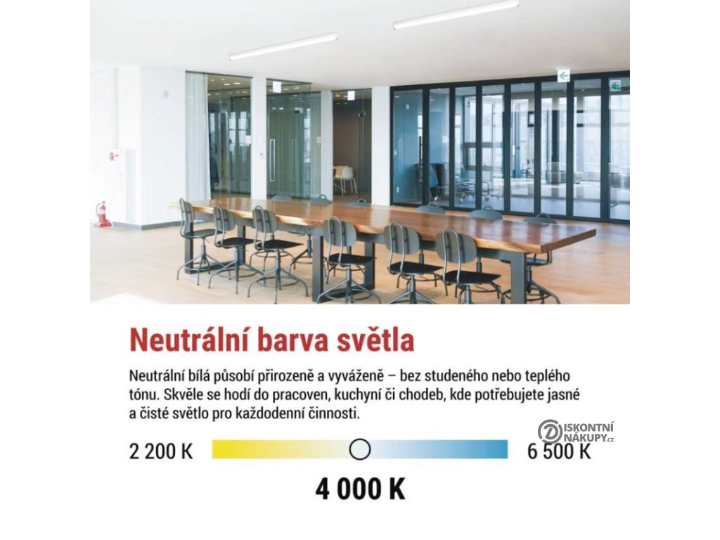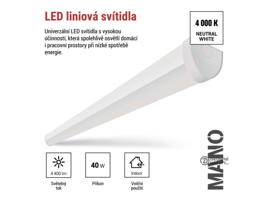 barva světla: neutrální bílá|barva těla: bílá|frekvence: 50/60 Hz|index podání barev (CRI): Ra >80|krytí: IP20|materiál: plast (PC)|materiál difuzoru: plast (PC)|materiál spon: nemá spony|materiál těla: plast (PC)|možnost stmívání: ne|náhrada za žárovku: neuvádí se|napětí: 220–240 V~|příkon: 40 W|prodejní obal: 1 ks, blistr|proud: 175 mA|průběžná montáž: neuvádí se|rozměr: 1 200 × 62 × 55 mm|rozsah pracovní teploty: -20 °C až +40 °C|stupeň ochrany proti mechanickým nárazům: IK06|světelný tok: 4 400 lm|světelný tok v nouzovém režimu: neuvádí se|teplota chromatičnosti: 4 000 K|třída ochrany: II|typ difuzoru: mléčný|typ montáže: přisazená|typ řízení: neuvádí se|úhel vyzařování: 120°|výdrž baterie: neuvádí se|záruční doba: 2 roky|záruka na baterii: neuvádí se|zdroj světla: LED|životnost: 25 000 hodinDoplňkové parametry