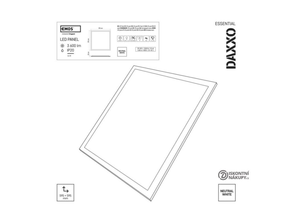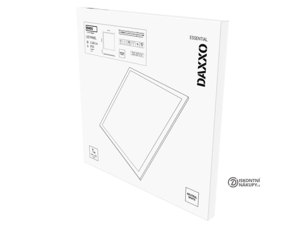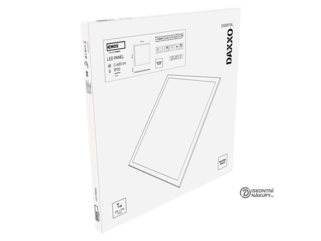 barva světla: neutrální bílá|barva těla: bílá|dálkový ovladač: ne|další funkce: –|do chodby a na schodiště: ne|do dílny a garáže: ne|do kanceláře: ano|do koupelny: ne|do kuchyně: ne|do obýváku, ložnice a dětského pokoje: ne|dosah senzoru: –|flicker-free: ano|frekvence: 50/60 Hz|index podání barev (CRI): Ra > 80|jazyky aplikace: –|kategorie: ESSENTIAL|kompatibilita: –|krytí: IP20|materiál difuzoru: plast (PC)|materiál LGP: –|materiál těla: ocelový plech|montážní otvor: –|možnost stmívání: ne|náhrada za žárovku: 4× 18 W CFL|napětí: 220–240 V|na zahradu a balkon: ne|notifikace do mobilní aplikace: ne|obsah balení: –|ovládání hlasovými asistenty: ne|podporované OS: –|pohybový senzor: ne|přenosová frekvence: –|příkon: 36 W|prodejní obal: 1 ks, krabice|protokol: –|proud: 155 mA|řada: DAXXO|rozměr: 595 × 595 × 30 mm|světelná účinnost: 100 lm/W|světelný tok: 3 600 lm|teplota chromatičnosti: 4 000 K|tvar: čtverec|typ difuzoru: mléčný|typ svítidla: panel|účiník: > 0,9|UGR<: 22|úhel vyzařování: 120°|umístění: stropní|výstupní proud ze zdroje: 860 mA|záruční doba: 2 roky|zdroj světla: LED|životnost: 25 000 hodin|způsob montáže: vestavnéDoplňkové parametry